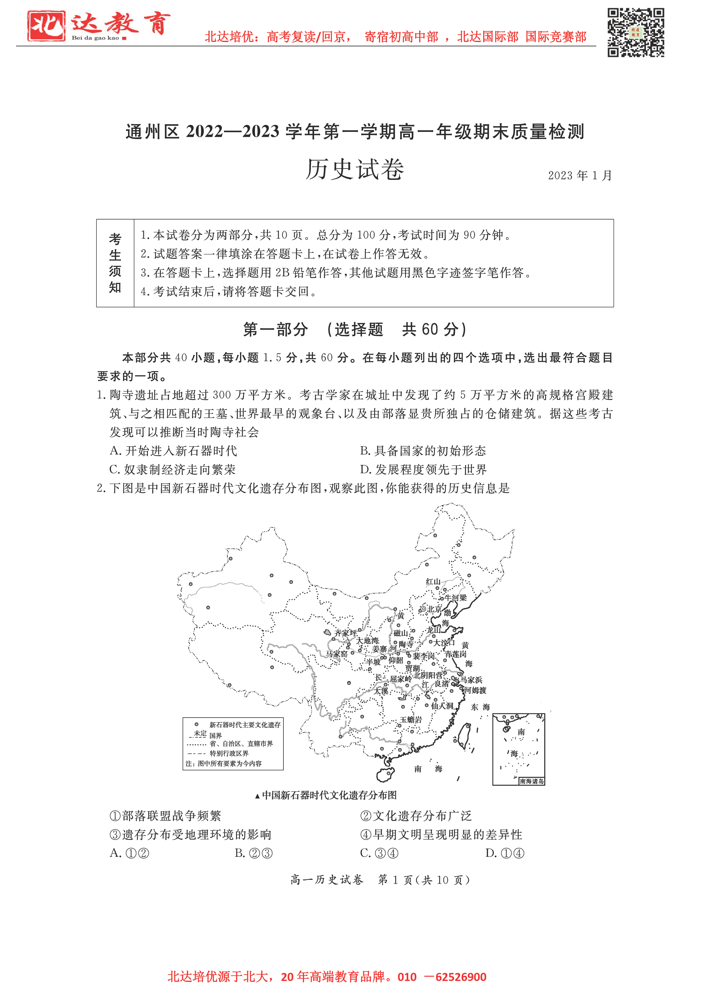 2023北京各区期末考试已陆续开始,为了方便同学们查找相关试题,admw360高考复读学校整理了2023年北京通州区高一上学期期末历史试题及答案,附高清电子版,欢迎为大家下载分享~