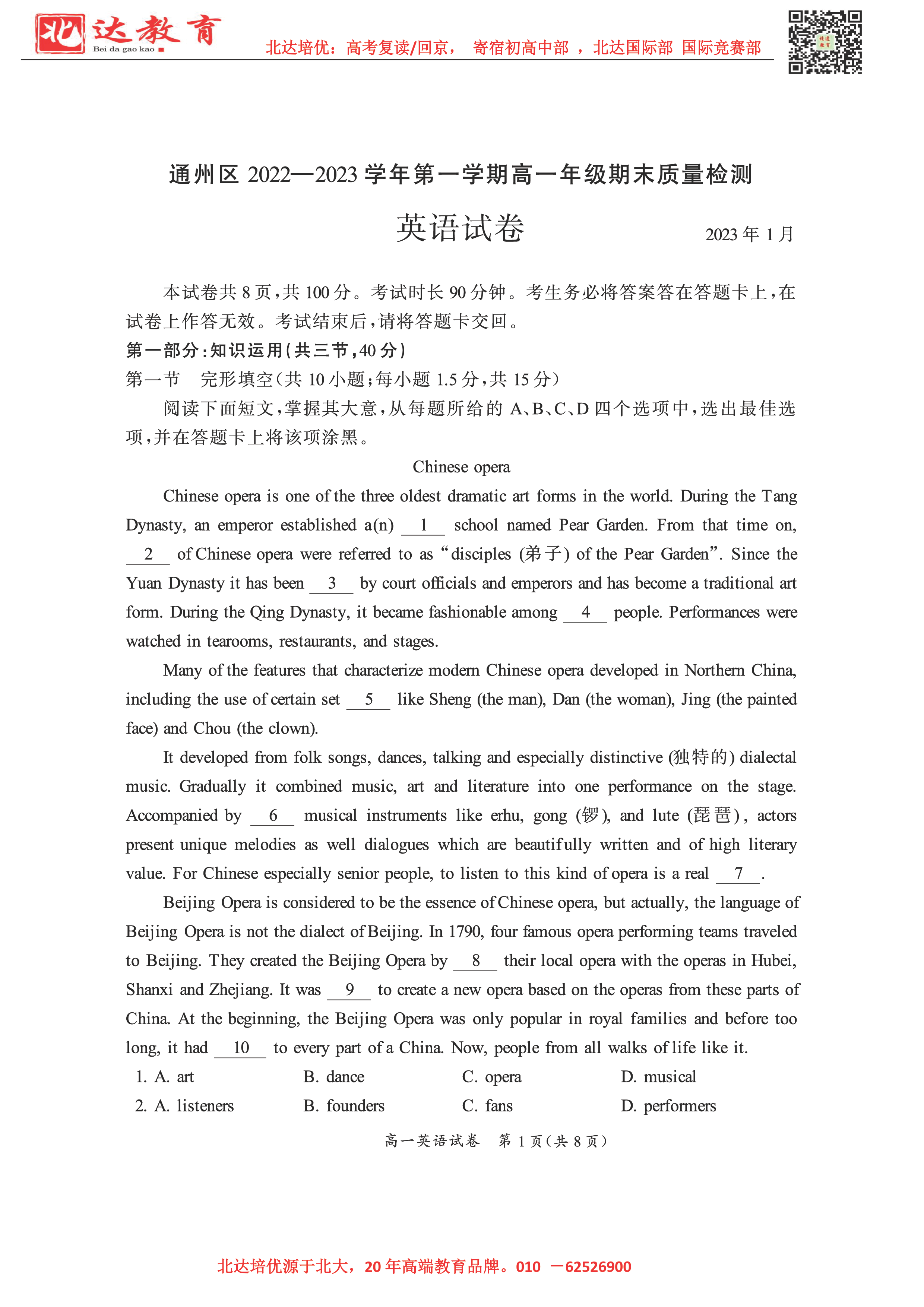 2023北京各区期末考试已陆续开始,为了方便同学们查找相关试题,admw360高考复读学校整理了2023年北京通州区高一上学期期末英语试题,附高清电子版,欢迎为大家下载分享~