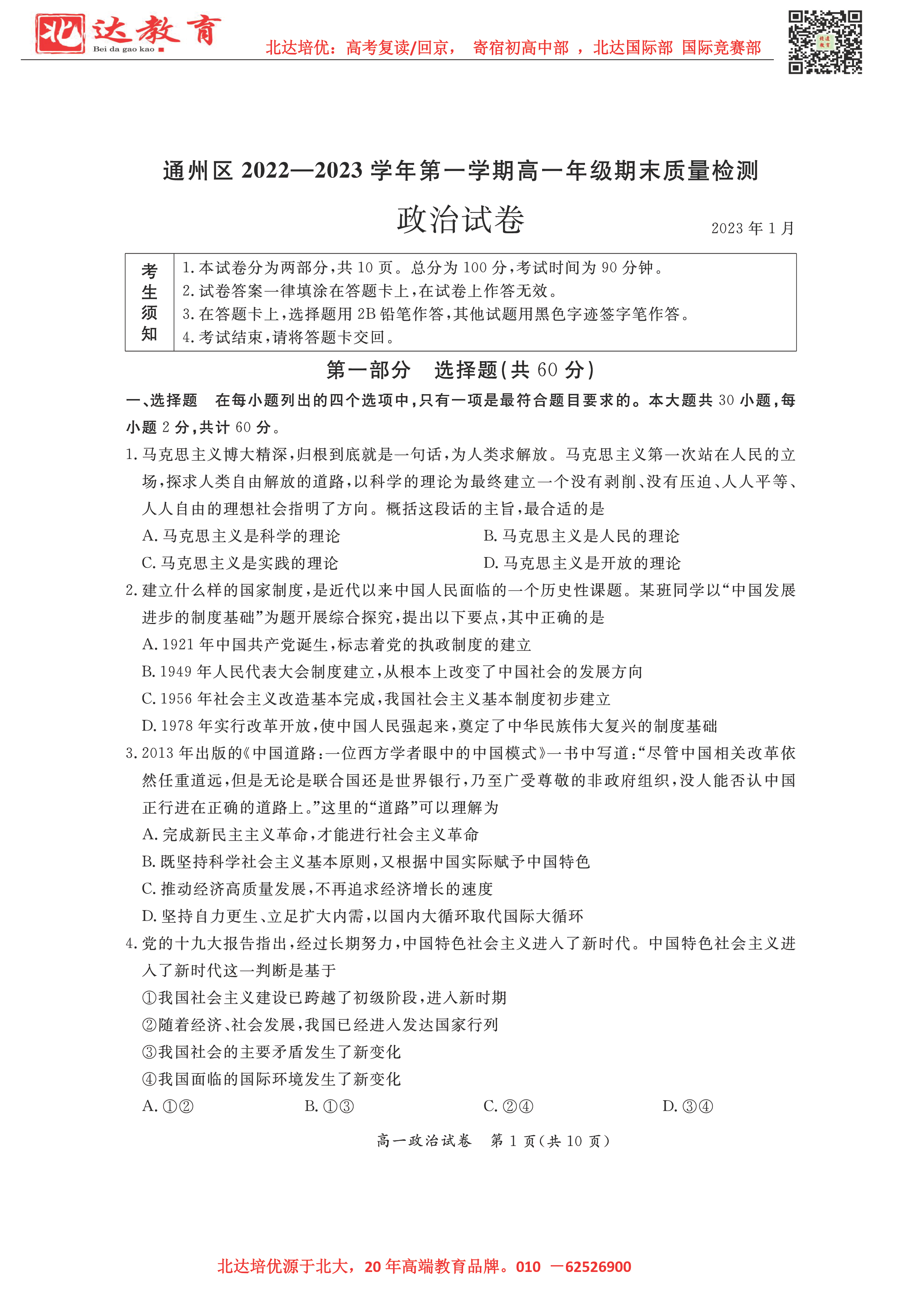 2023北京各区期末考试已陆续开始,为了方便同学们查找相关试题,admw360高考复读学校整理了2023年北京通州区高一上学期期末政治试题及答案,附高清电子版,欢迎为大家下载分享~