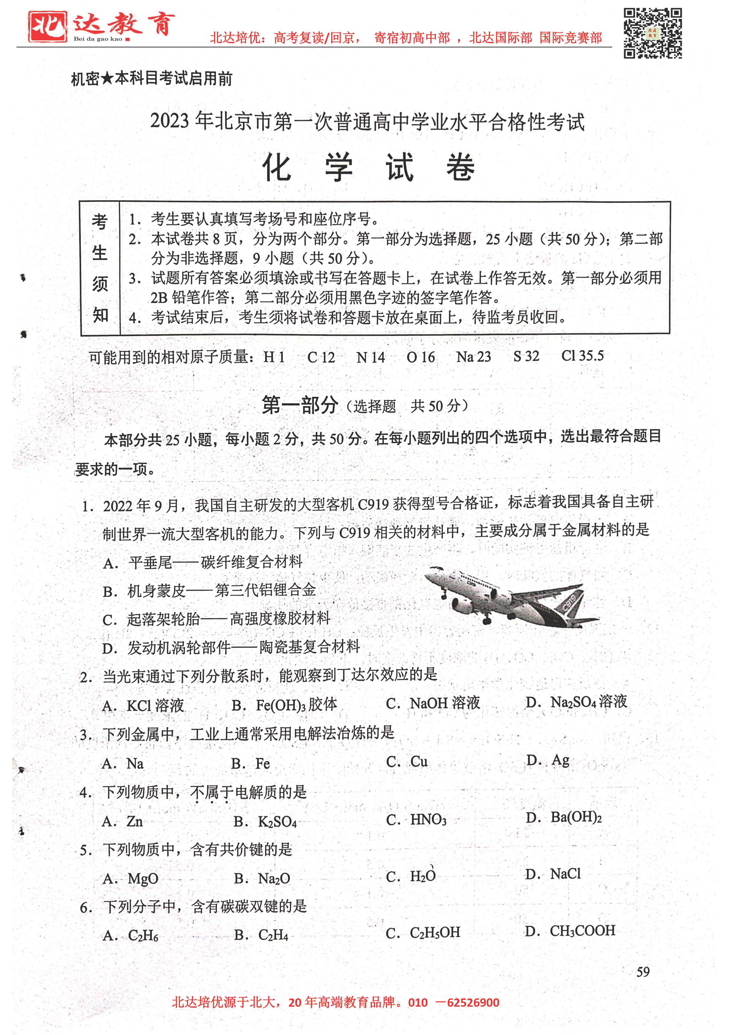 2023年北京第一次普通高中学业水平合格性考试目前考试已结束,为大家整理了2023年北京市第一次普通高中学业水平合格性考试化学试题及答案,需要的同学可以下载练习。