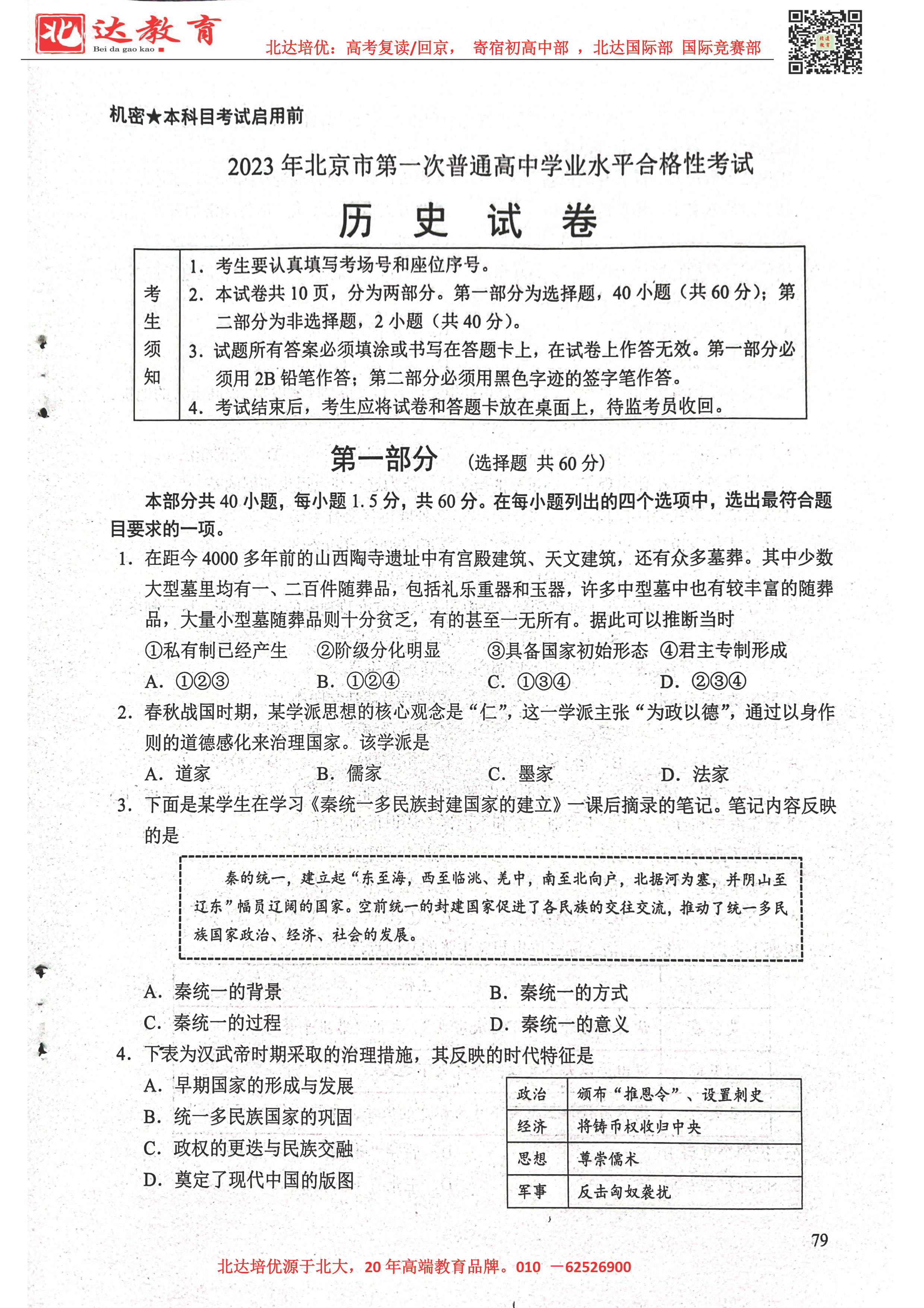 2023年北京第一次普通高中学业水平合格性考试目前考试已结束,为大家整理了2023年北京市第一次普通高中学业水平合格性考试历史试题及答案,需要的同学可以下载练习。