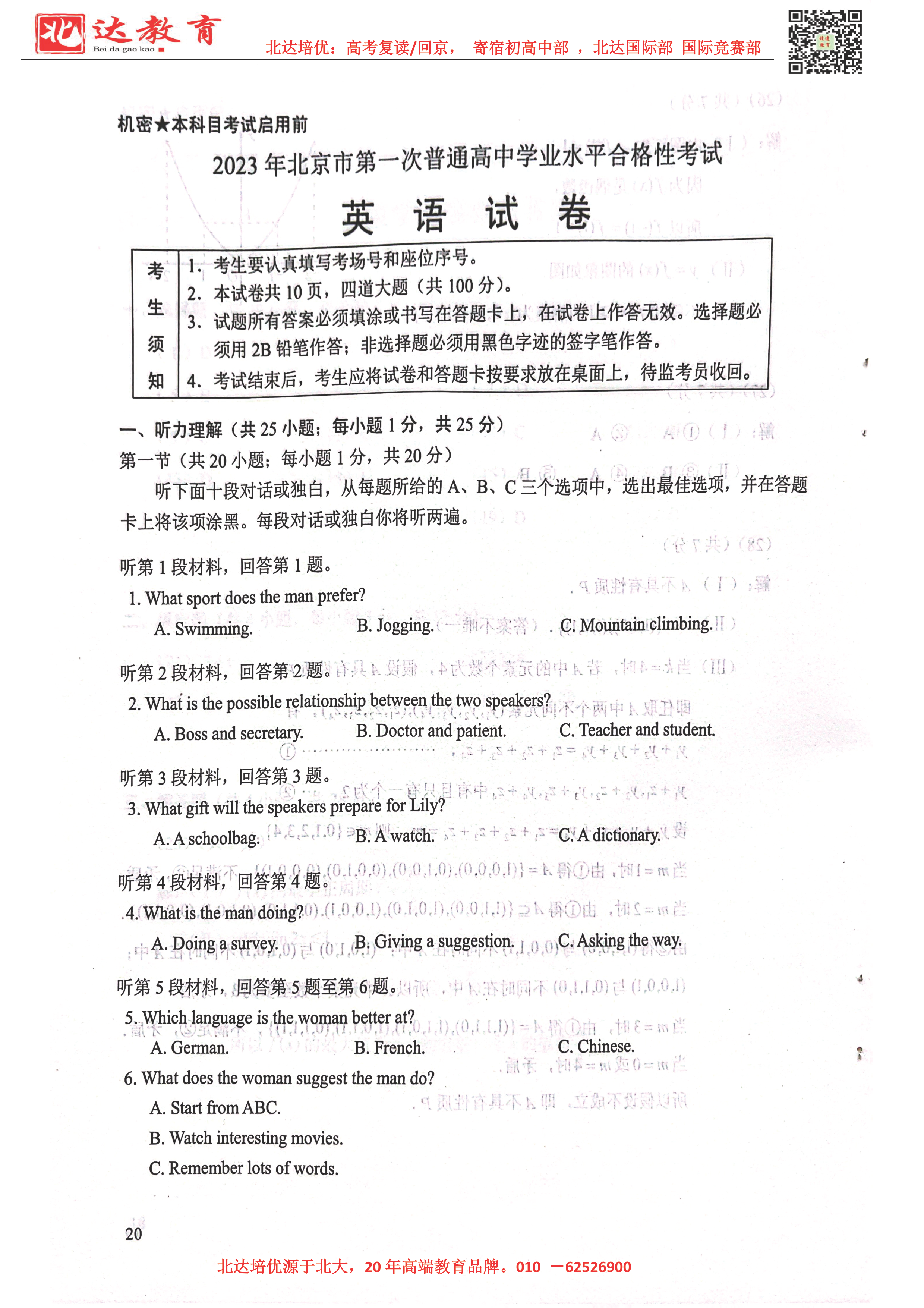 2023年北京第一次普通高中学业水平合格性考试目前考试已结束,为大家整理了2023年北京市第一次普通高中学业水平合格性考试英语试题及答案,需要的同学可以下载练习。