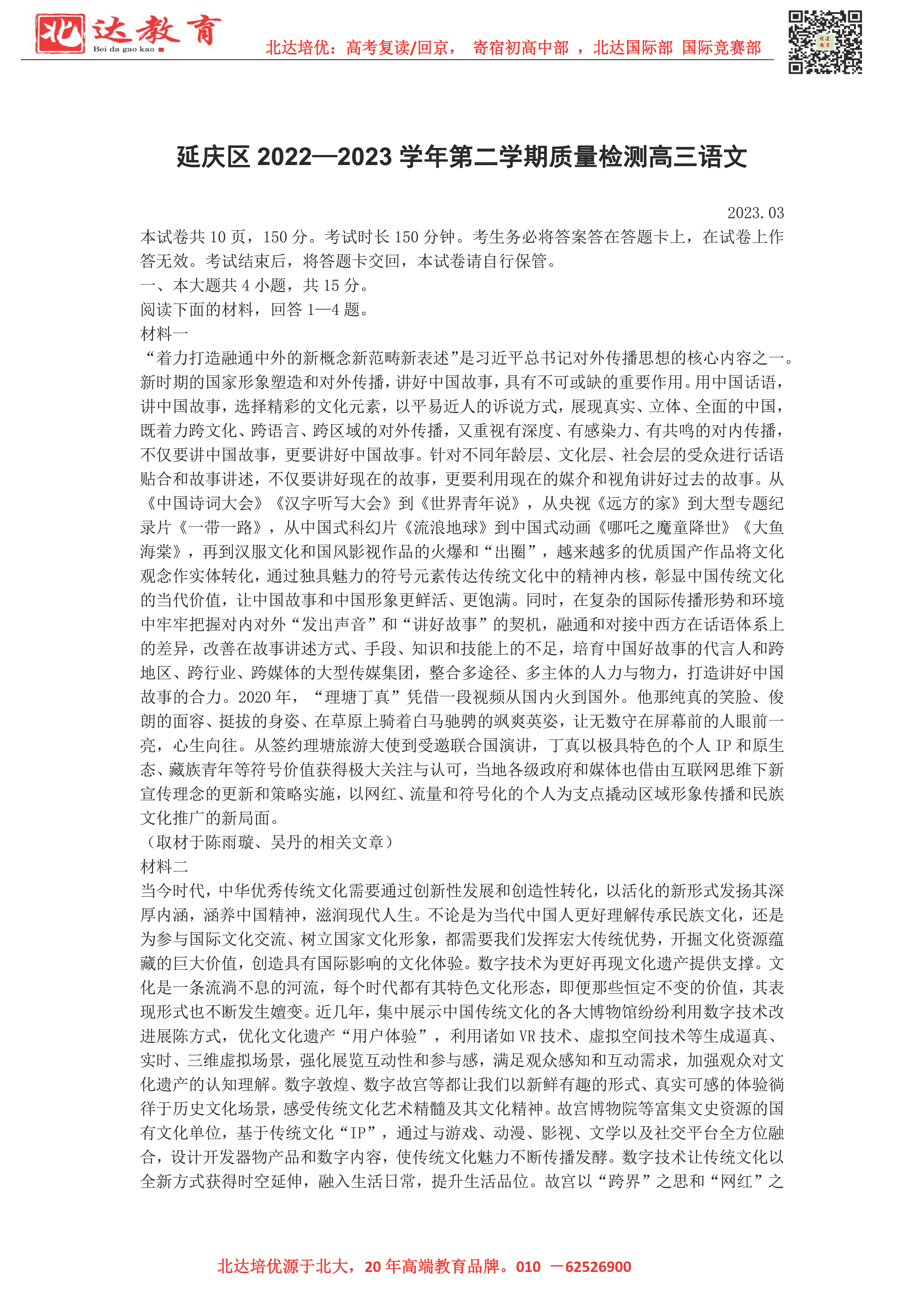 2023年北京延庆区高三一模已开考,为了方便同学们查找相关试题,admw360高考复读学校整理了2023年北京延庆区高三一模语文试题及答案,附高清电子版,欢迎为大家下载分享~