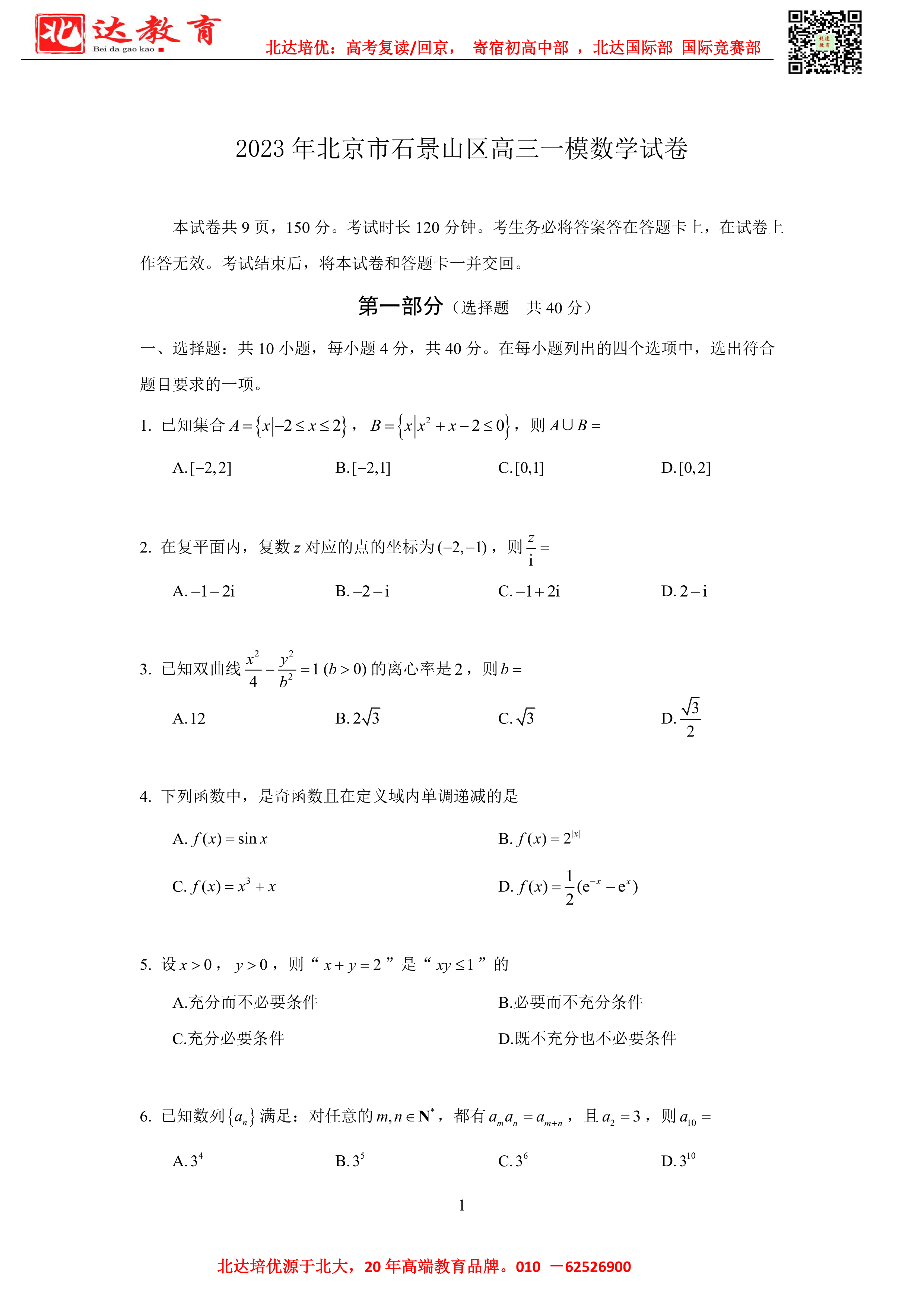 2023年北京石景山区高三一模已开考,为了方便同学们查找相关试题,admw360高考复读学校整理了2023年北京石景山区高三一模数学试题及答案,附高清电子版,欢迎为大家下载分享~