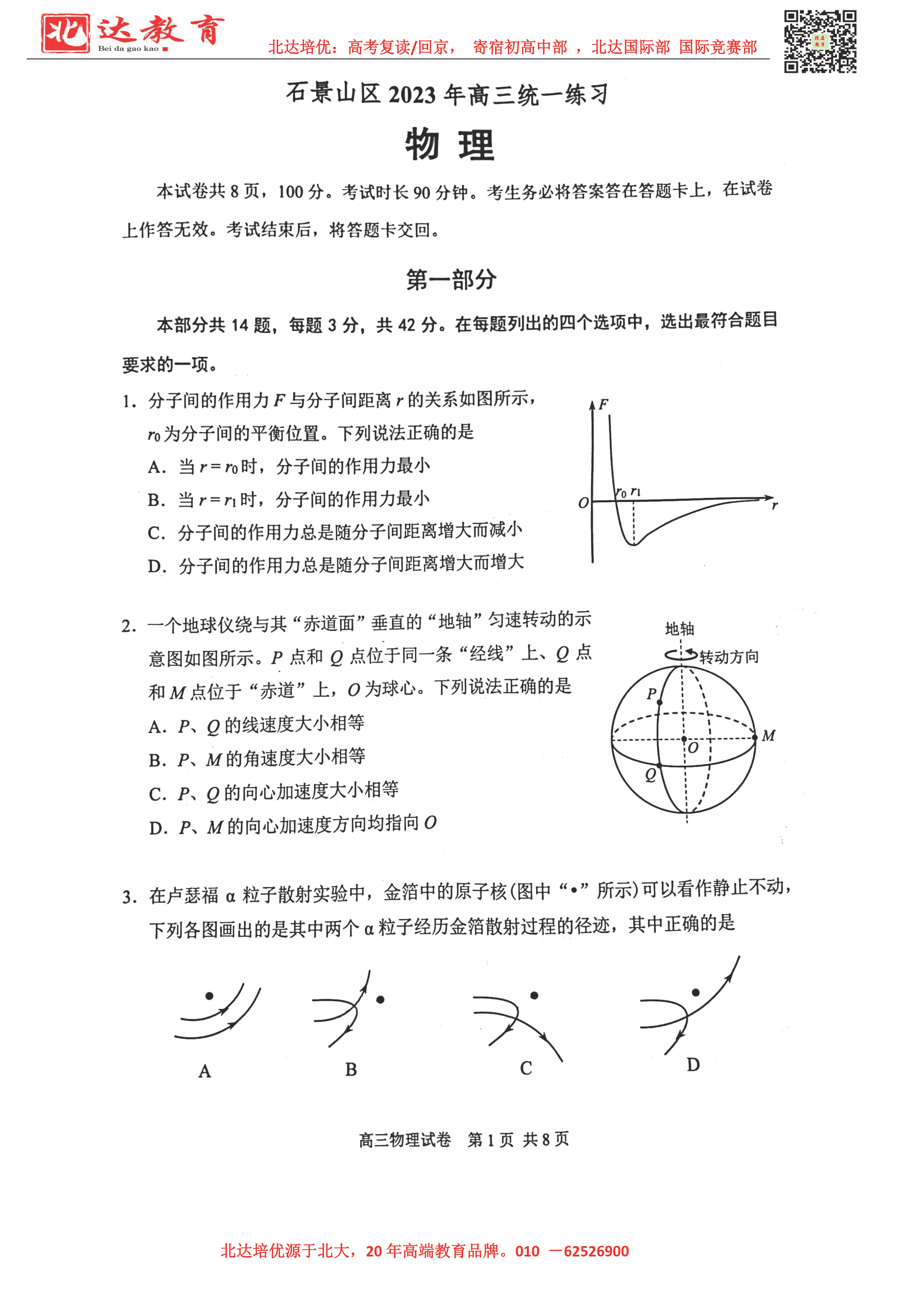 2023年北京石景山区高三一模已开考,为了方便同学们查找相关试题,admw360高考复读学校整理了2023年北京石景山区高三一模物理试题及答案,附高清电子版,欢迎为大家下载分享~