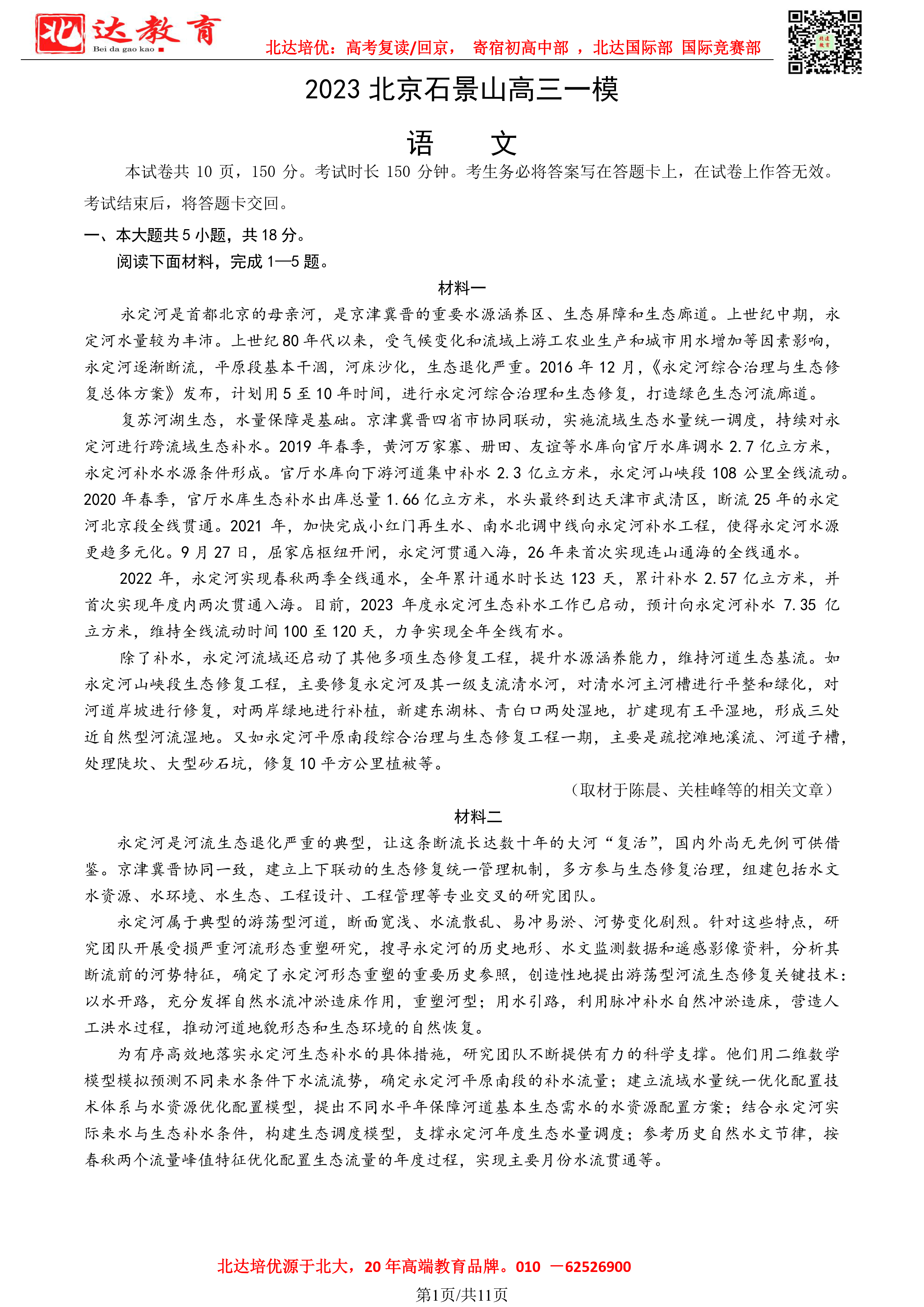 2023年北京石景山区高三一模已开考,为了方便同学们查找相关试题,admw360高考复读学校整理了2023年北京石景山区高三一模语文试题及答案,附高清电子版,欢迎为大家下载分享~