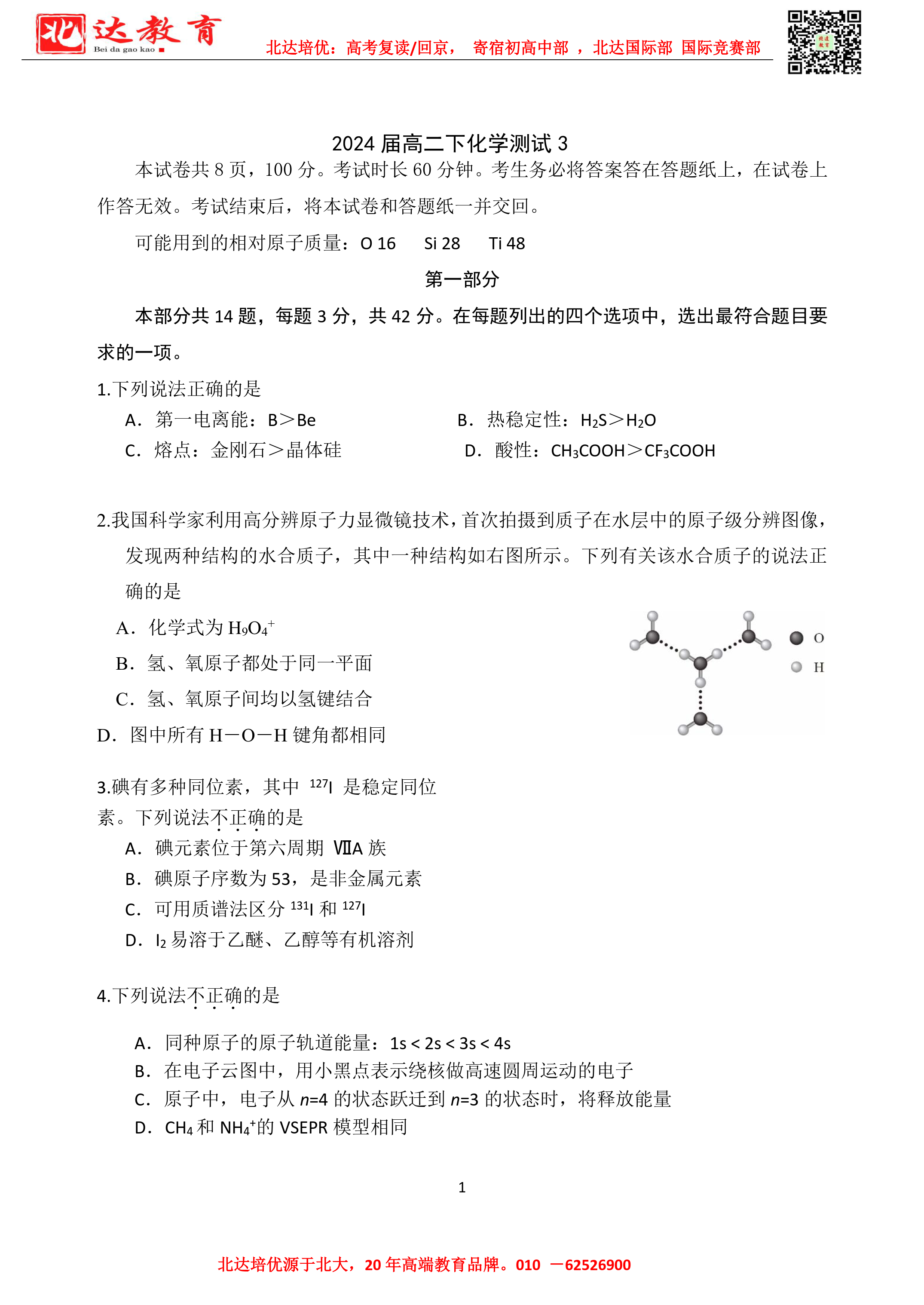 2023北京各区高二3月月考正进行中,admw360高考复读学校整理了2023北京北师大实验中学高二3月月考化学试题及答案,同学们可以在线下载学习!