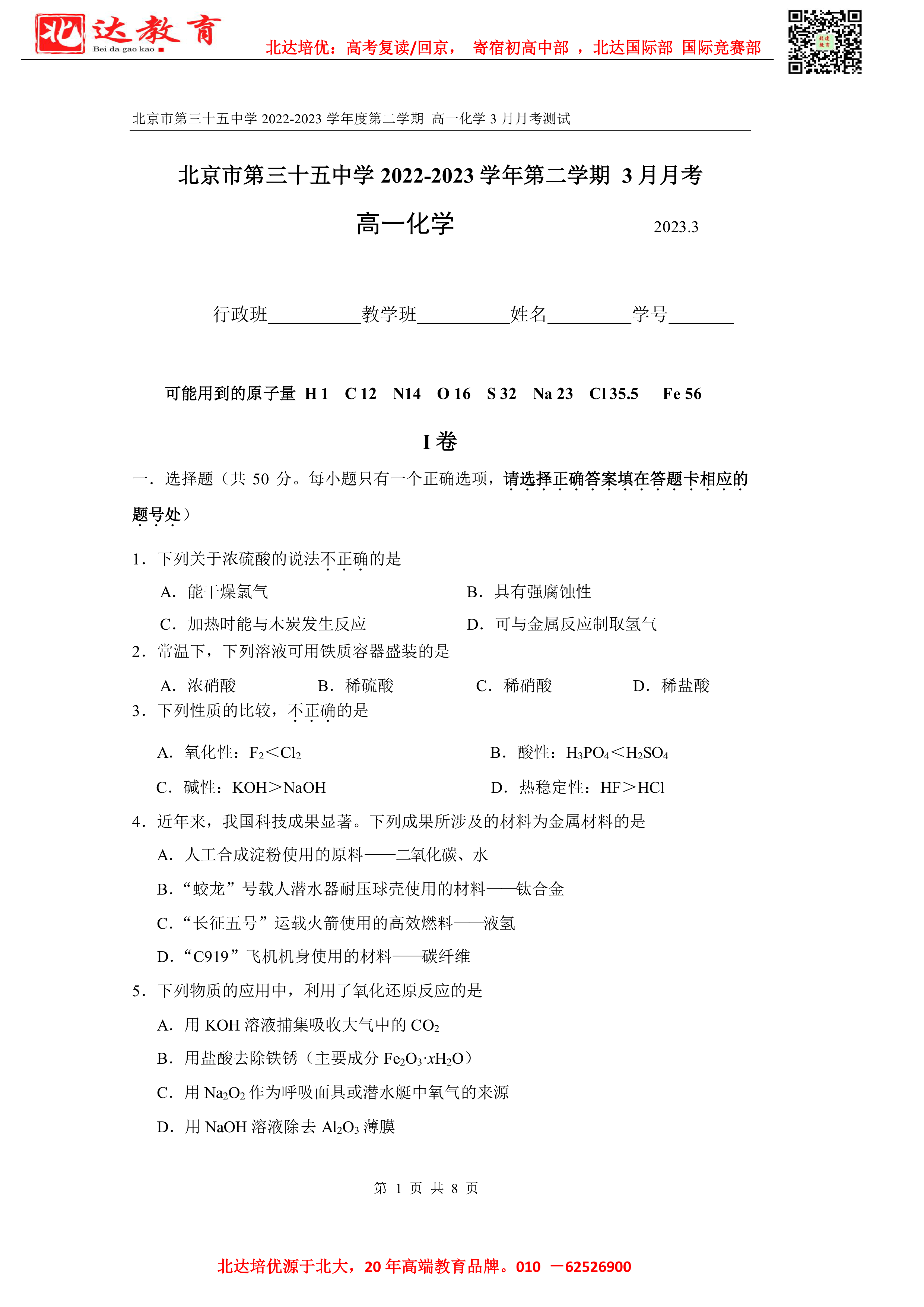 2023北京各区高一3月月考正进行中,admw360高考复读学校整理了2023北京三十五中高一3月月考化学试题,同学们可以在线下载学习!