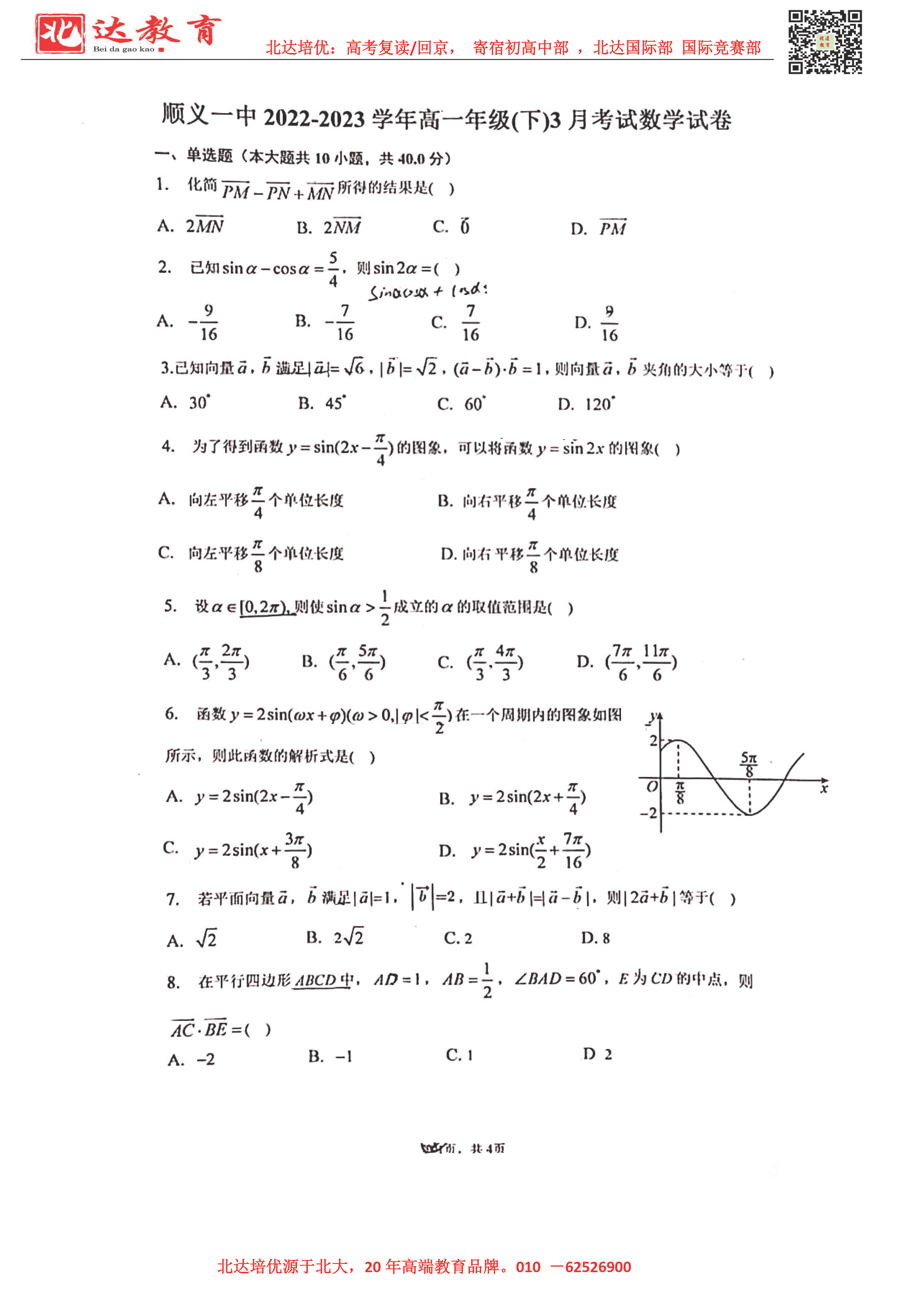 2023北京各区高一3月月考正进行中,admw360高考复读学校整理了2023北京顺义一中高一3月月考数学试题,同学们可以在线下载学习!