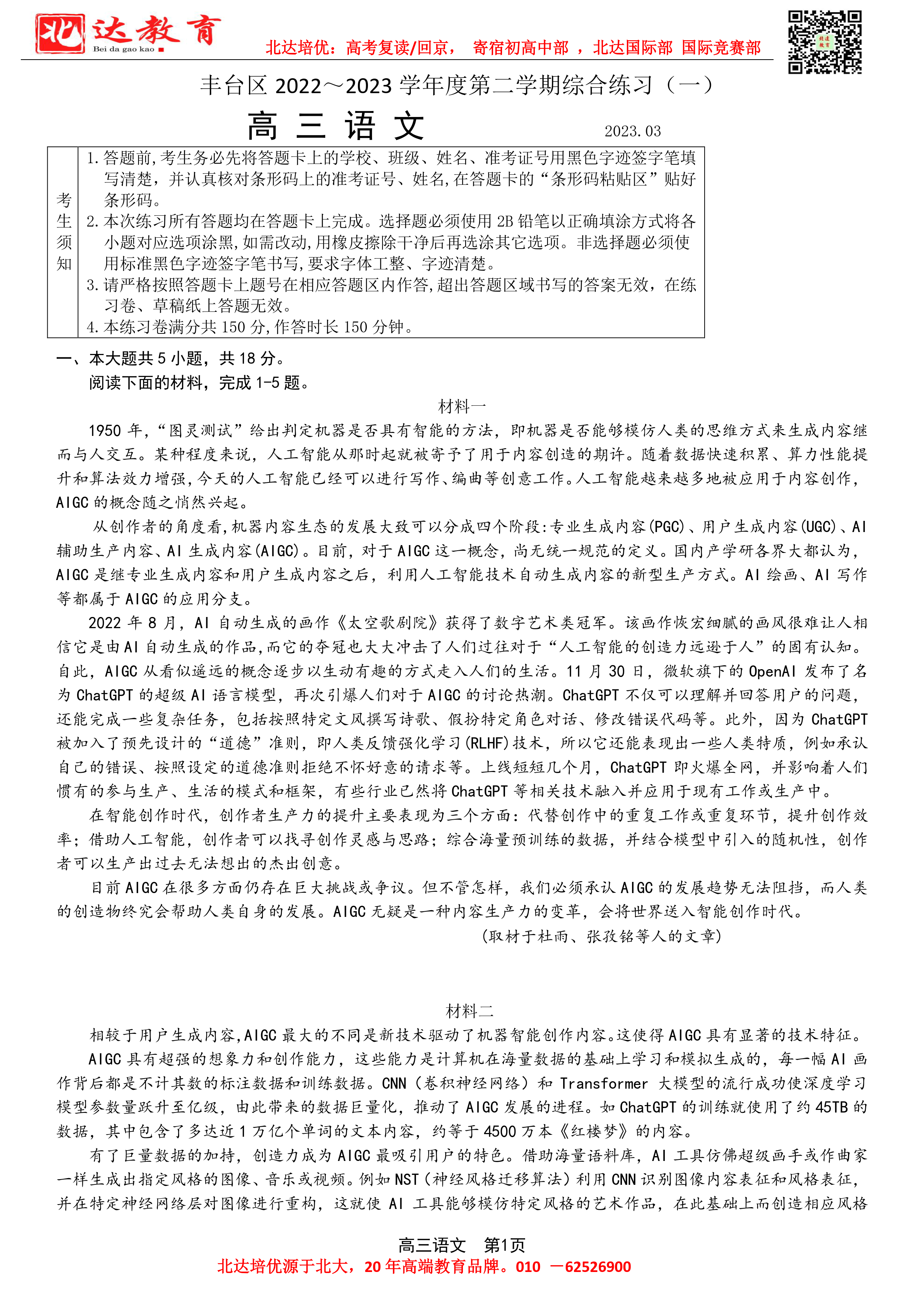 2023年北京丰台高三一模考于3月21日启动,为了方便同学们查找相关试题,admw360高考复读学校整理了2023年北京丰台高三一模语文试题及答案,附高清电子版,欢迎为大家下载分享~