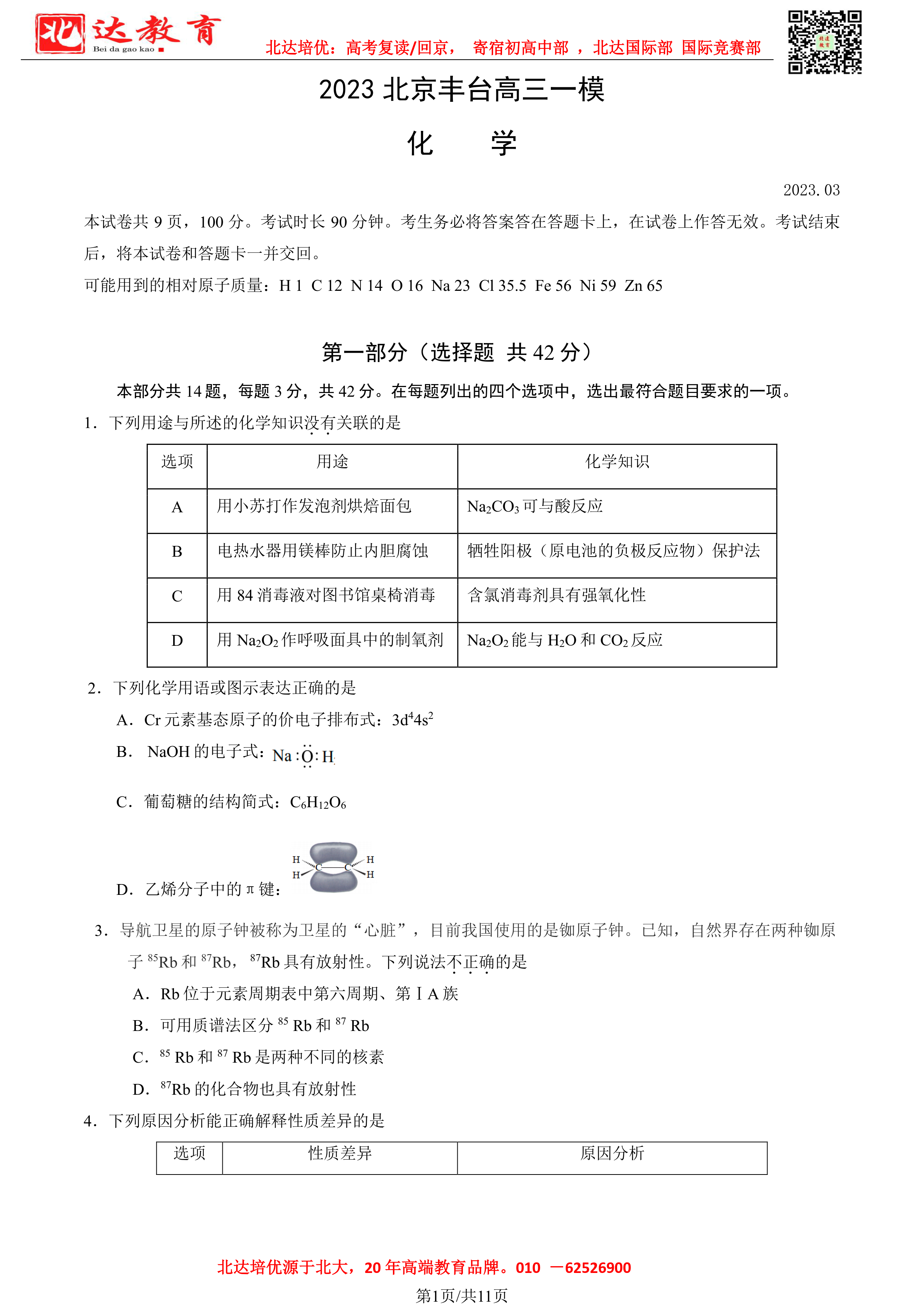 2023年北京丰台高三一模考于3月21日启动,为了方便同学们查找相关试题,admw360高考复读学校整理了2023年北京丰台高三一模化学试题及答案,附高清电子版,欢迎为大家下载分享~