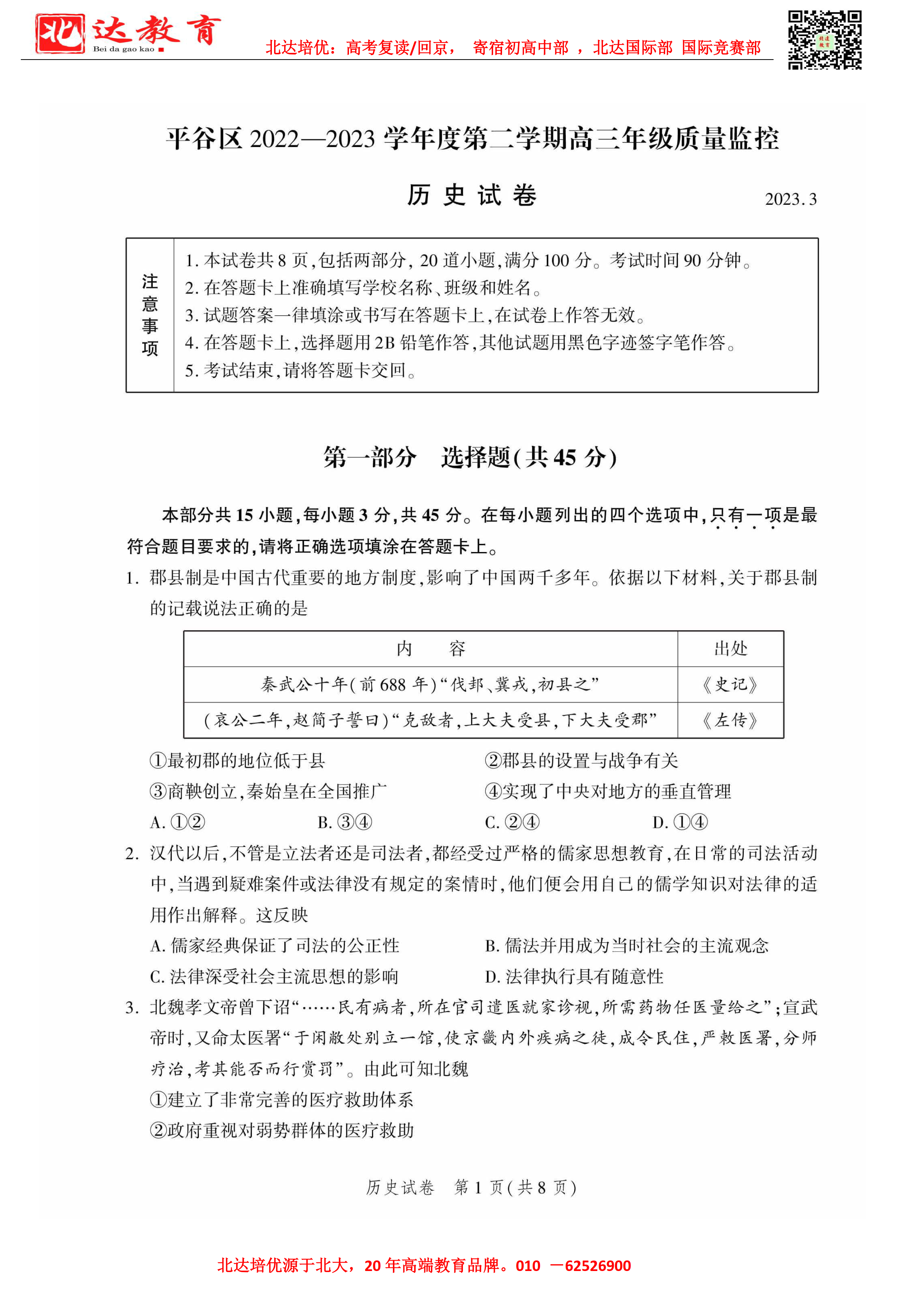 2023年北京平谷区高三一模考于3月底启动,为了方便同学们查找相关试题,admw360高考复读学校整理了2023年北京平谷区高三一模历史试题,附高清电子版,欢迎为大家下载分享~