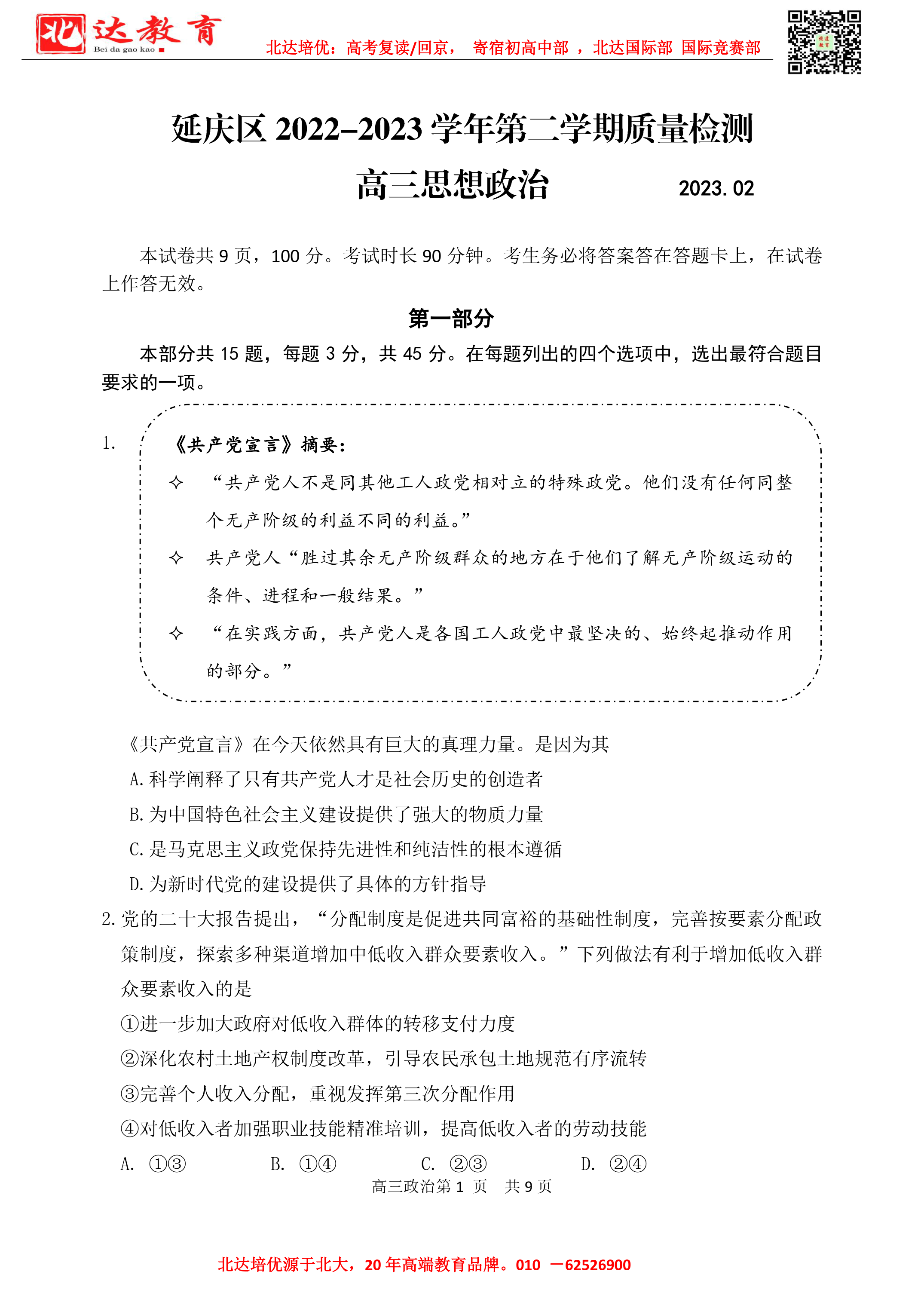 2023年北京延庆区高三一模已开考,为了方便同学们查找相关试题,admw360高考复读学校整理了2023年北京延庆区高三一模政治试题及答案,附高清电子版,欢迎为大家下载分享~