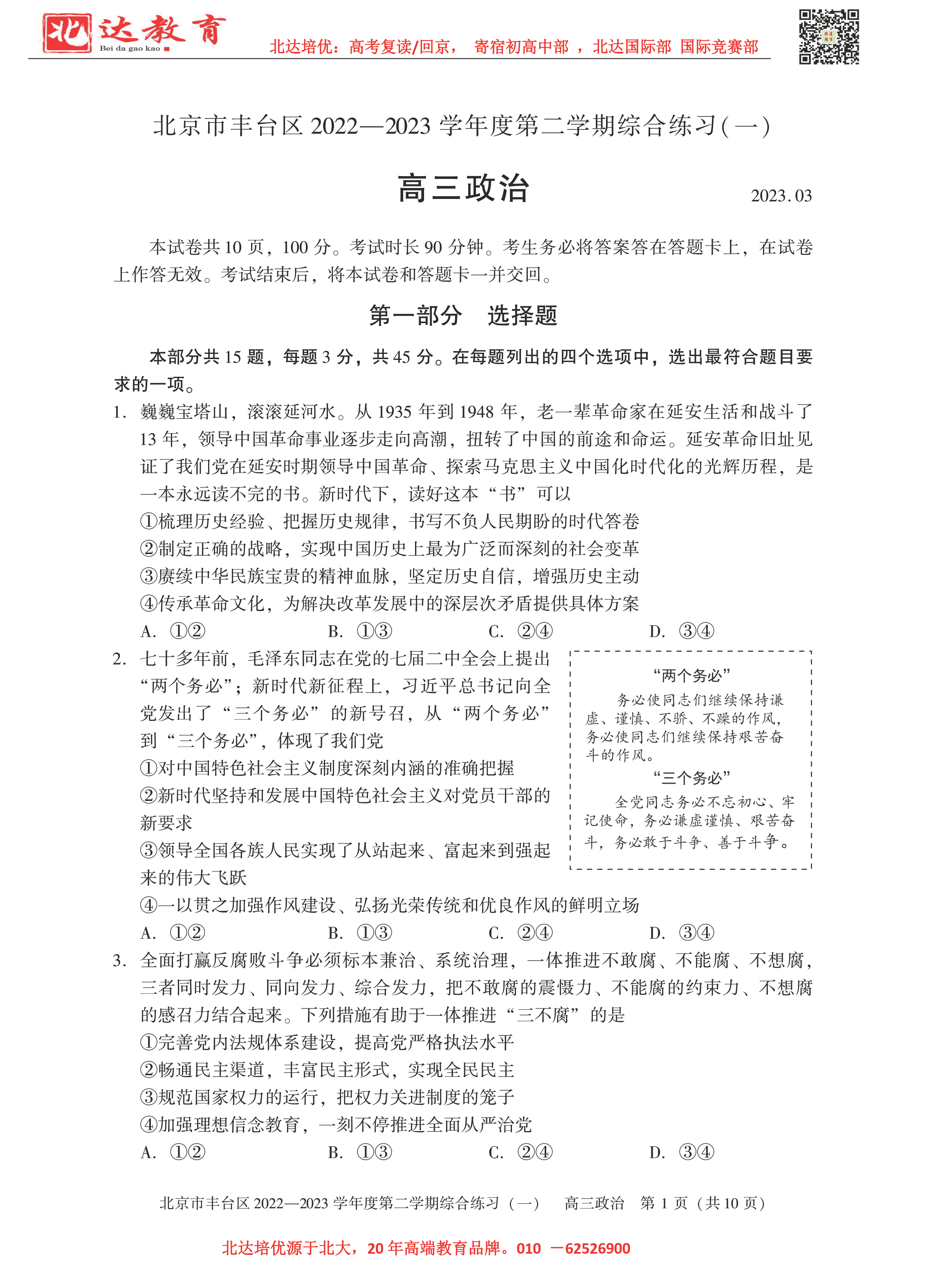 2023年北京丰台高三一模考于3月21日启动,为了方便同学们查找相关试题,admw360高考复读学校整理了2023年北京丰台区高三一模政治试题及答案,附高清电子版,欢迎为大家下载分享~