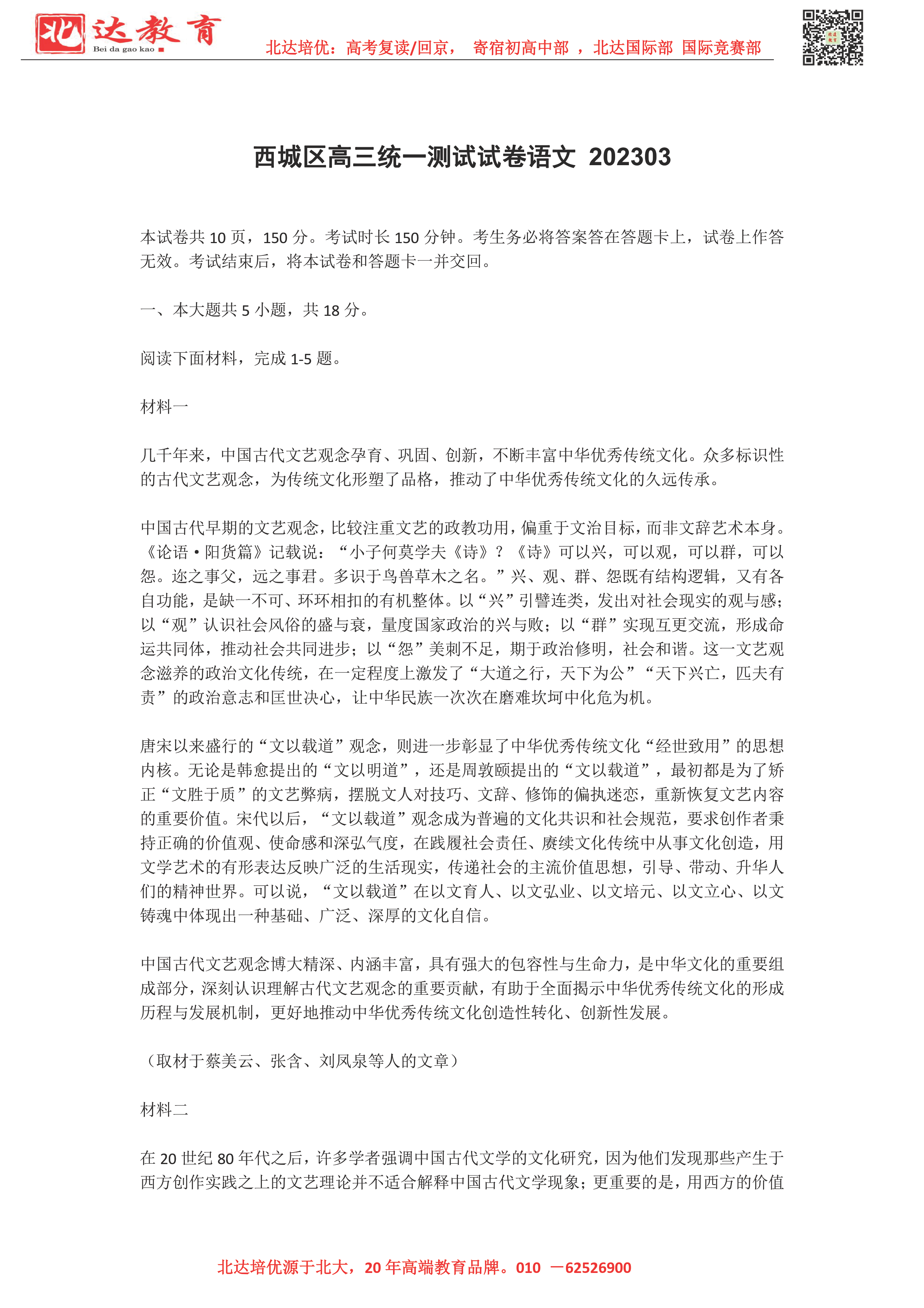 2023年北京西城区高三一模考于3月27日启动,为了方便同学们查找相关试题,admw360高考复读学校整理了2023年北京西城区高三一模语文试题及答案,附高清电子版,欢迎为大家下载分享~