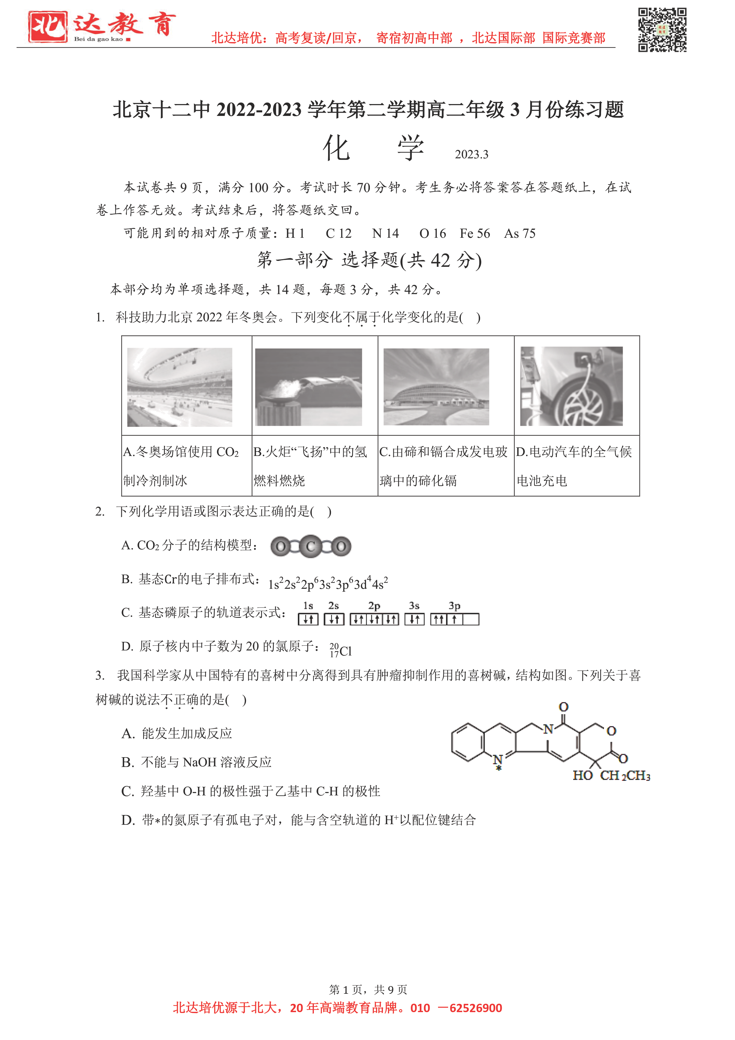 2023北京各区高二3月月考正进行中,admw360高考复读学校整理了2023北京十二中高二3月月考化学试题及答案,同学们可以在线下载学习!
