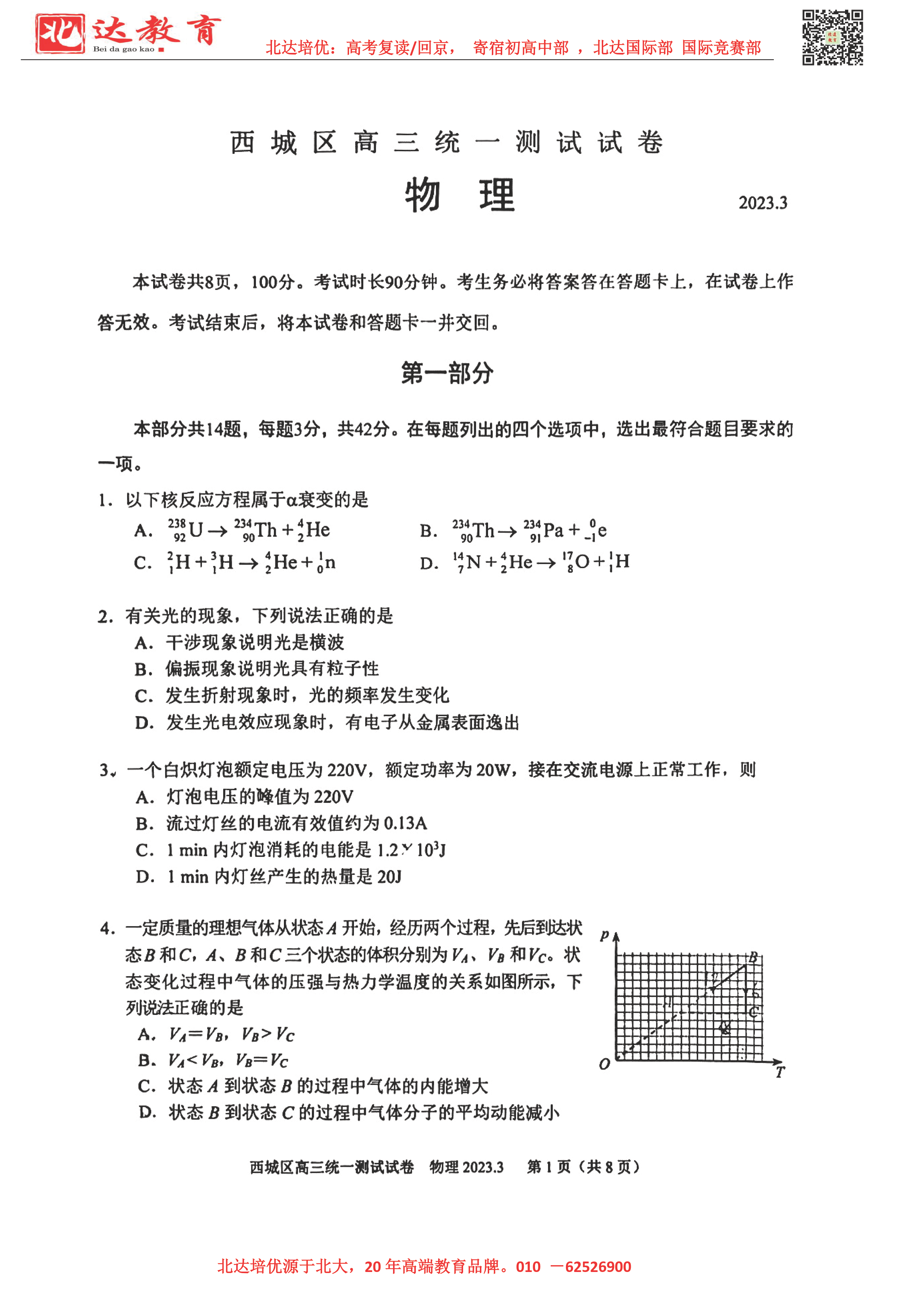 2023年北京西城一模考于3月27日启动,为了方便同学们查找相关试题,admw360高考复读学校整理了2023年北京西城区高三一模物理试题及答案,附高清电子版,欢迎为大家下载分享~