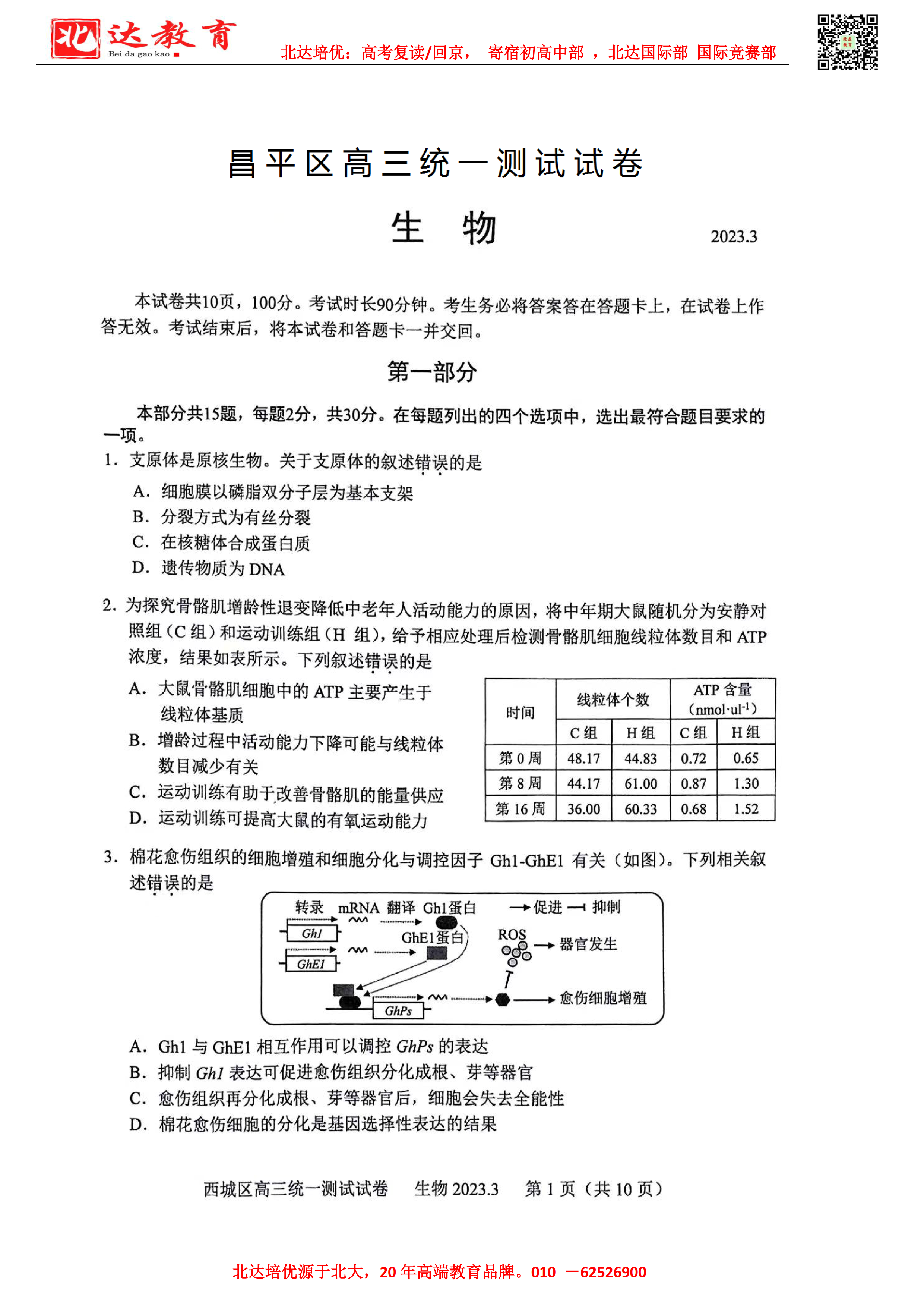 2023年北京昌平区高三一模于3月27日开考,为了方便大家查找,admw360高考复读学校整理了2023年北京昌平区高三一模生物试题及答案,分享给大家。