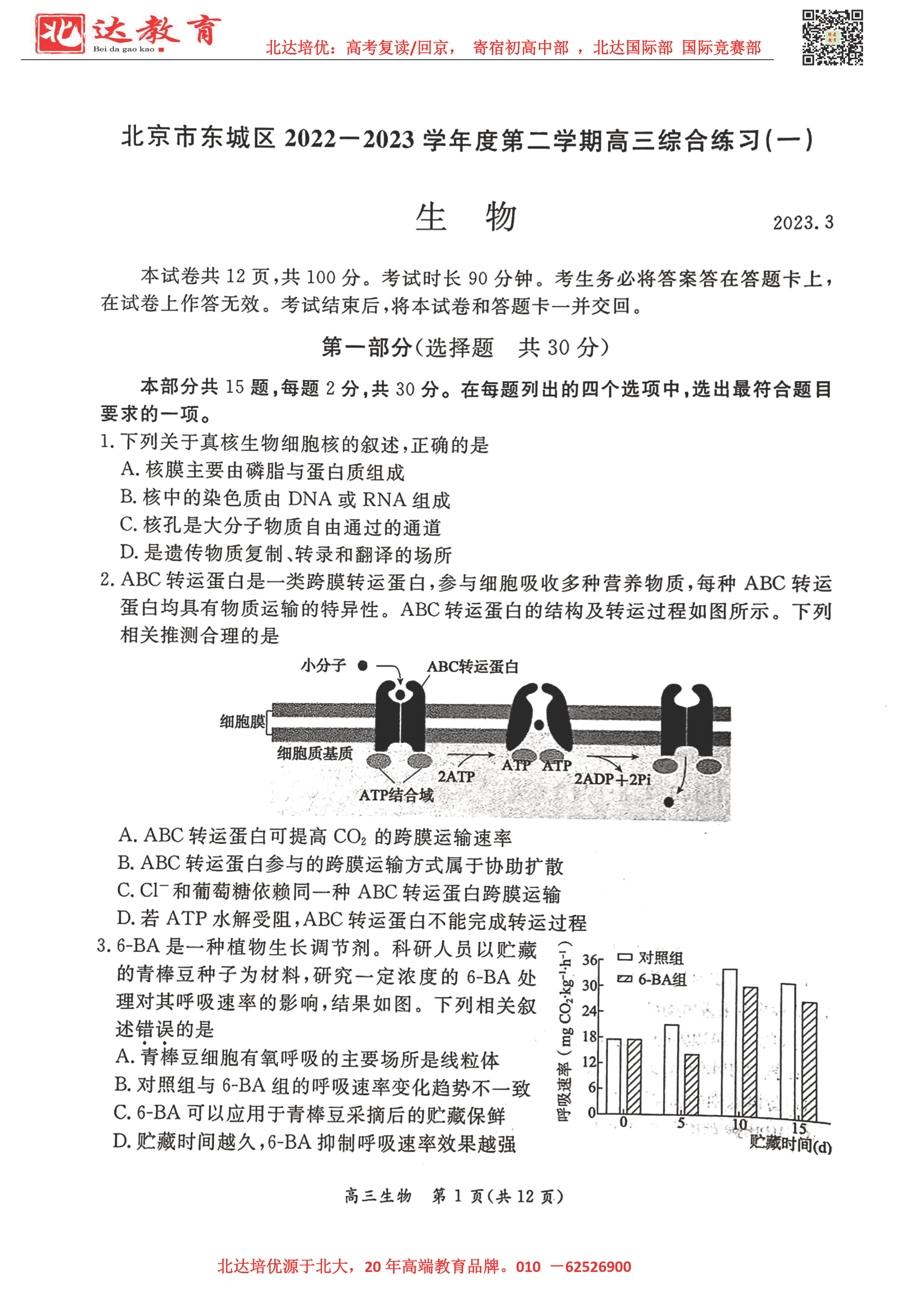 2023年北京东城区高三一模考试于3月27日-30日进行,为了方便同学们查找相关试题,admw360高考复读学校整理了2023年北京东城区高三一模生物试题及答案,附高清电子版,欢迎为大家下载分享~