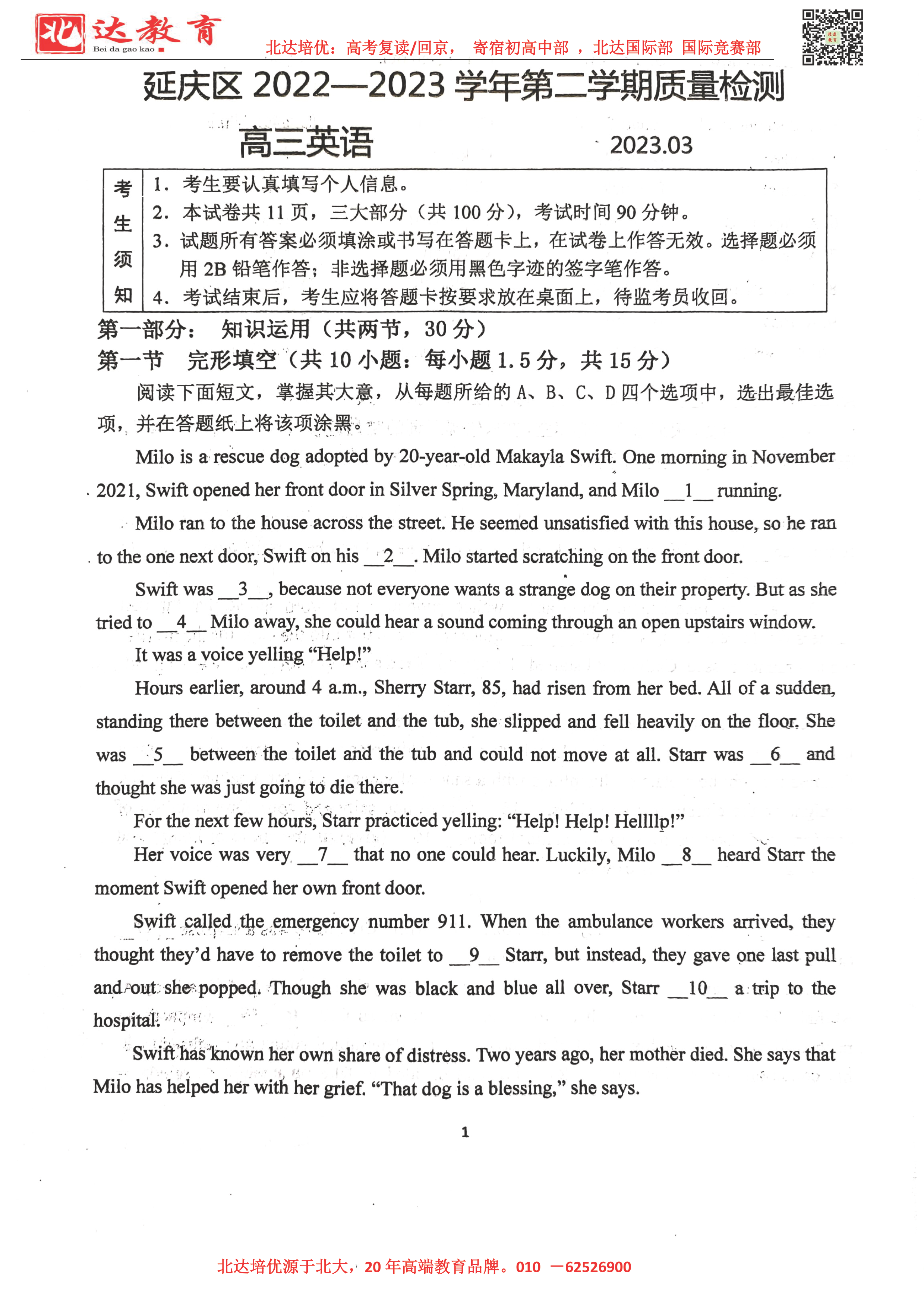 2023年北京延庆区高三一模已开考,为了方便同学们查找相关试题,admw360高考复读学校整理了2023年北京延庆区高三一模英语试题及答案,附高清电子版,欢迎为大家下载分享~