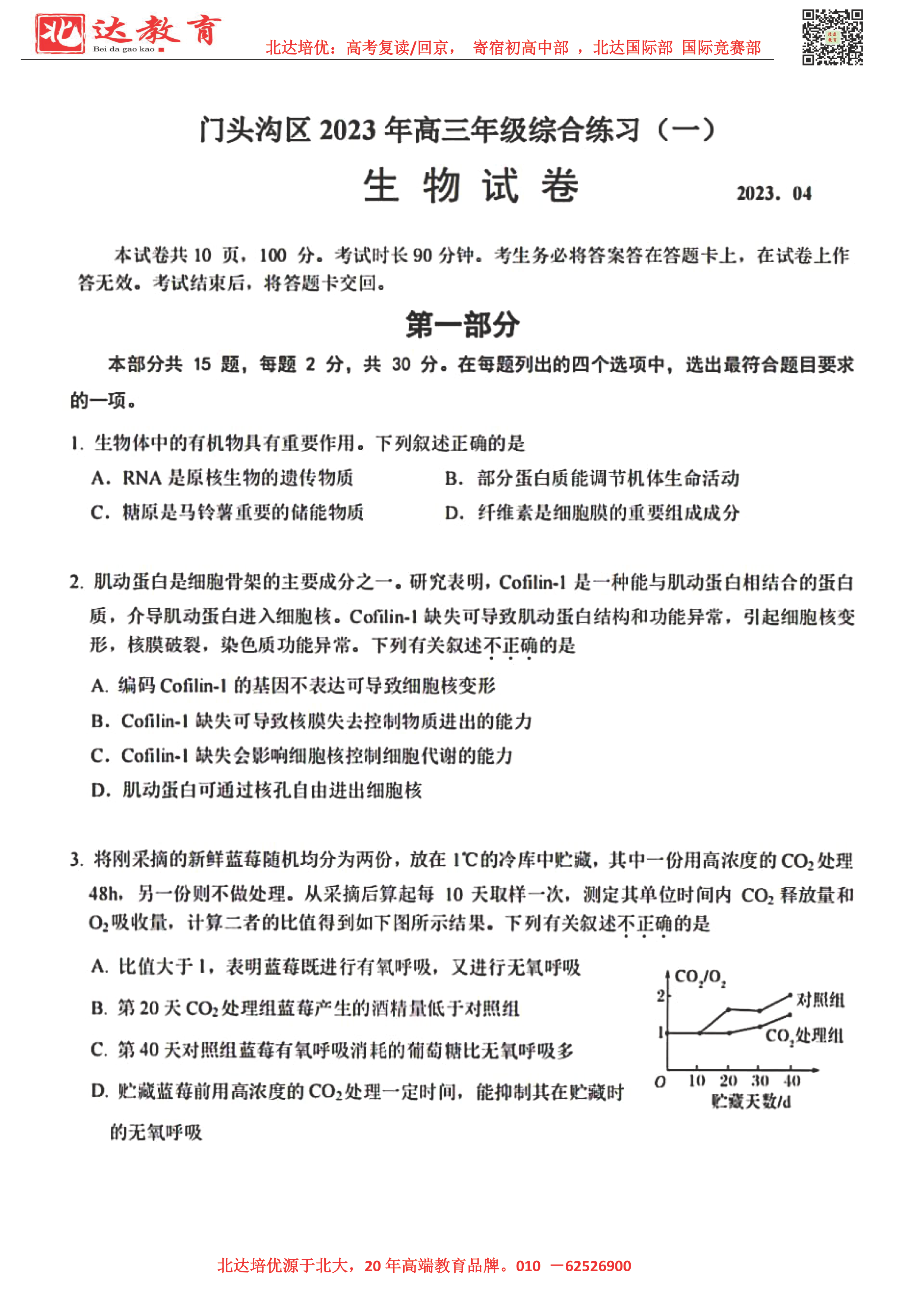 2023年北京门头沟高三一模考于4月初启动,为了方便同学们查找相关试题,admw360高考复读学校整理了2023年北京门头沟区高三一模生物试题及答案,附高清电子版,欢迎为大家下载分享~
