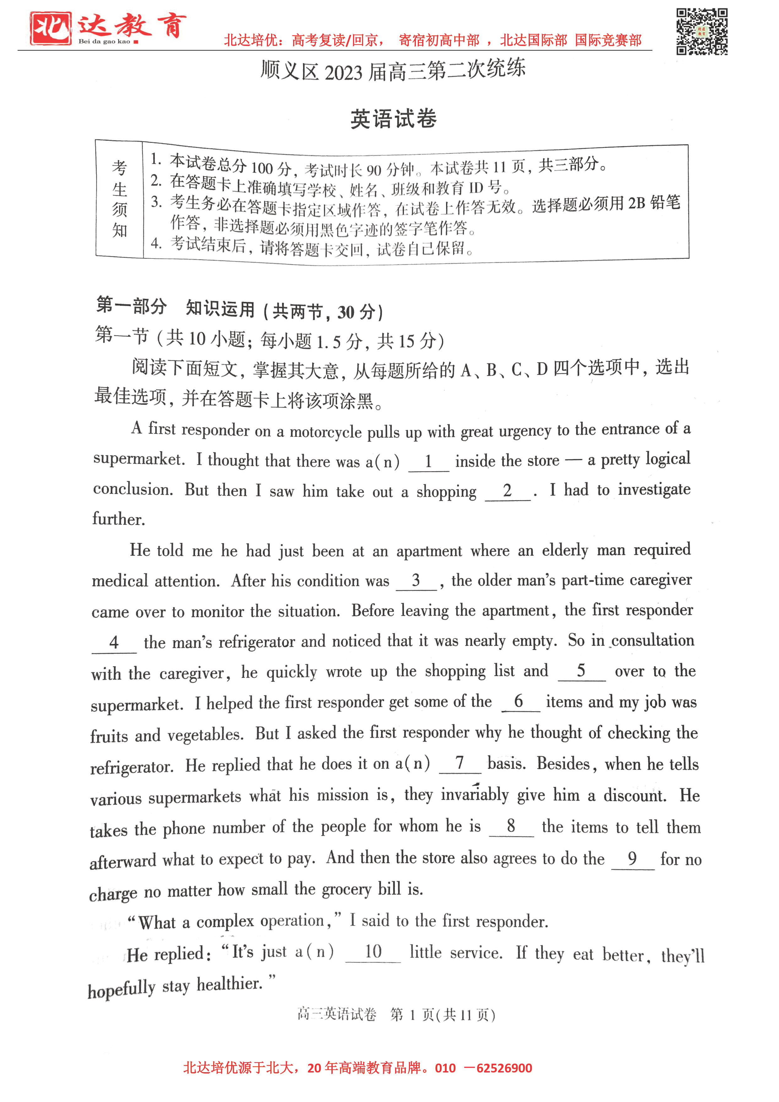 2023年北京顺义区高三一模考于3月底启动,为了方便同学们查找相关试题,admw360高考复读学校整理了2023年北京顺义区高三一模英语试题及答案,附高清电子版,欢迎为大家下载分享~