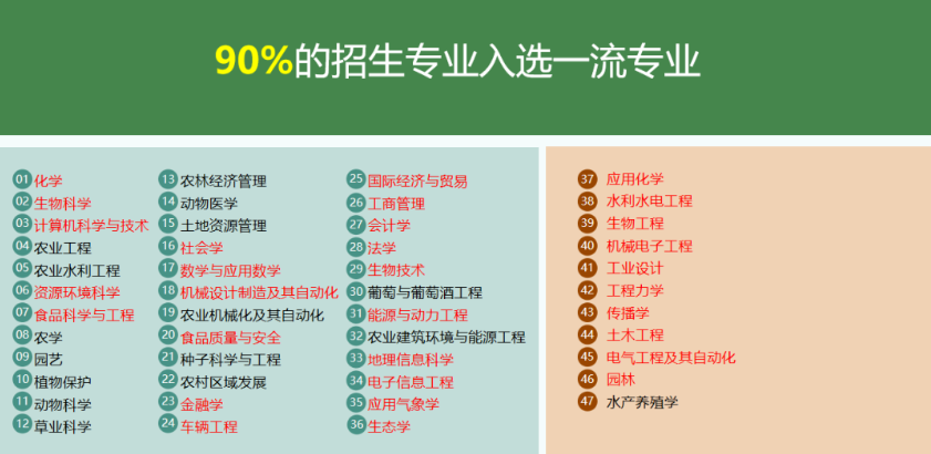 其中,生物科学、生物育种科学获批开展基础学科招生改革试点(简称“强基计划”),是全国首个入选“强基计划”的农林高校;理科试验班推免率可以达到70%;中国农业大学生物技术 +北理工生物医药工程联合学士学位推免率可以达到50%。