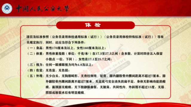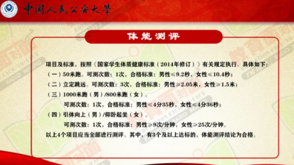 报考公安大学公安专业的北京考生,均须参加由北京市公安局组织的政治考察、面试、体检和体能测评。政治考察、面试、体检或体能测评结论不合格的,不予录取。上述测试安排在高考结束后进行,时间一般为6月底或7月初,具体时间请考生及时关注我校官网或官微通知。