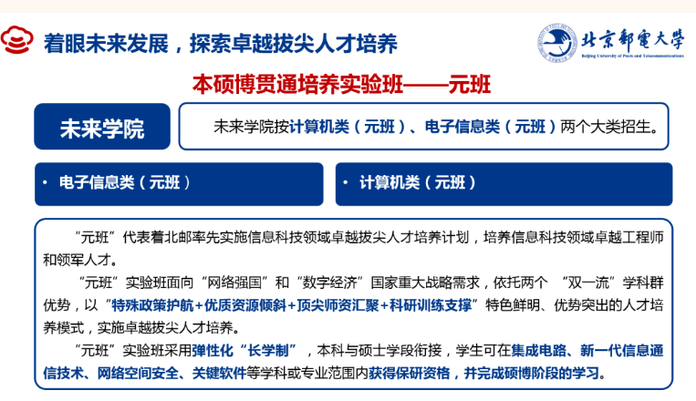 为面向国家重大战略需求,面向信息科技前沿,培养高端急需人才,北京邮电大学成立未来学院,依托学校在信息科技领域的领先地位,充分发挥“信息网络科学与技术学科群”和“计算机科学与网络安全学科群”两个“双一流”学科群优势,设立本硕博贯通培养实验班—元班,以“特殊政策护航+优质资源倾斜+顶尖师资汇聚+科研训练支撑”特色鲜明、优势突出的人才培养模式,实施卓越拔尖人才培养,培养信息科技领域卓越工程师和领军人才。