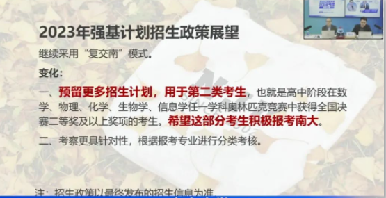 直播中还提到2023年南京大学特殊招生流程依然和去年一样,未发生太大的变化。但更加注重考生平时学业成绩优异、基础学科特长突出。