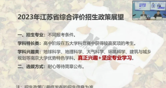 直播同时,南京大学2023年江苏省综合评价招生政策也做了展望。主要是从五大基础学科特长类和学科兴趣类做了强调,更希望有学科基础特长、在学科上有真正兴趣并且坚定专业学习的同学积极报名。