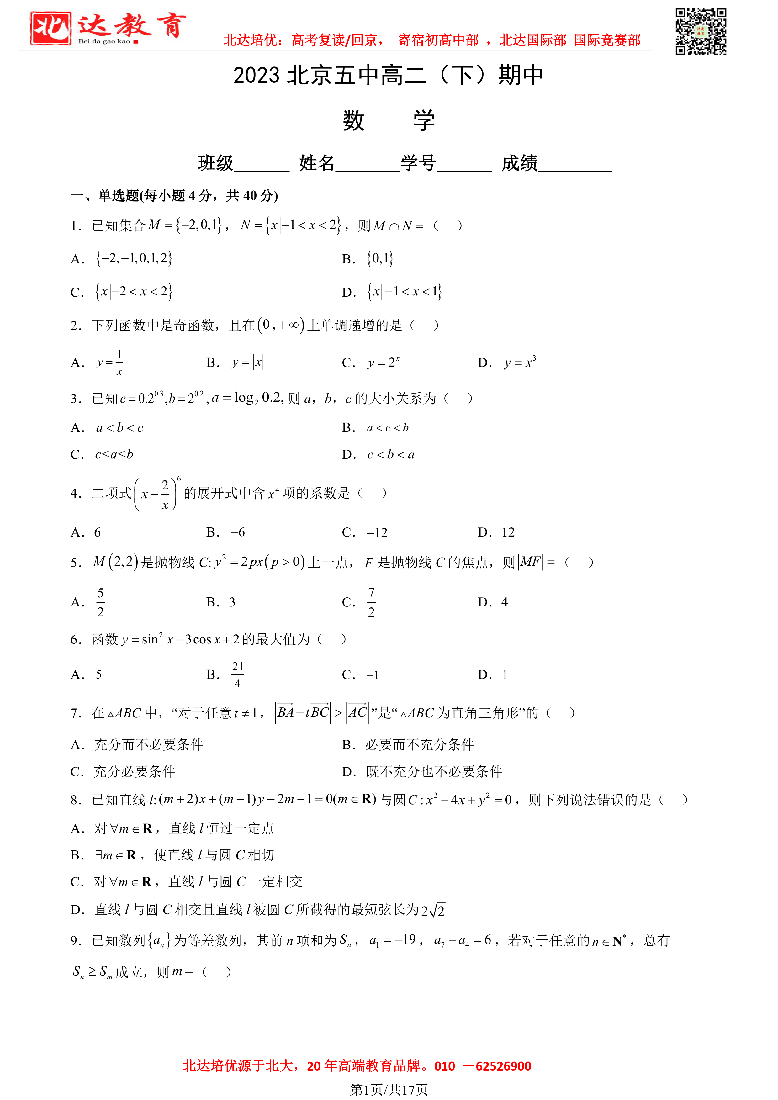 2022-2023学年北京各区高二年级下学期期中考试已开始,admw360高考复读学校整理了2022-2023学年北京五中高二(下)期中数学试题及答案,供同学们在线下载!