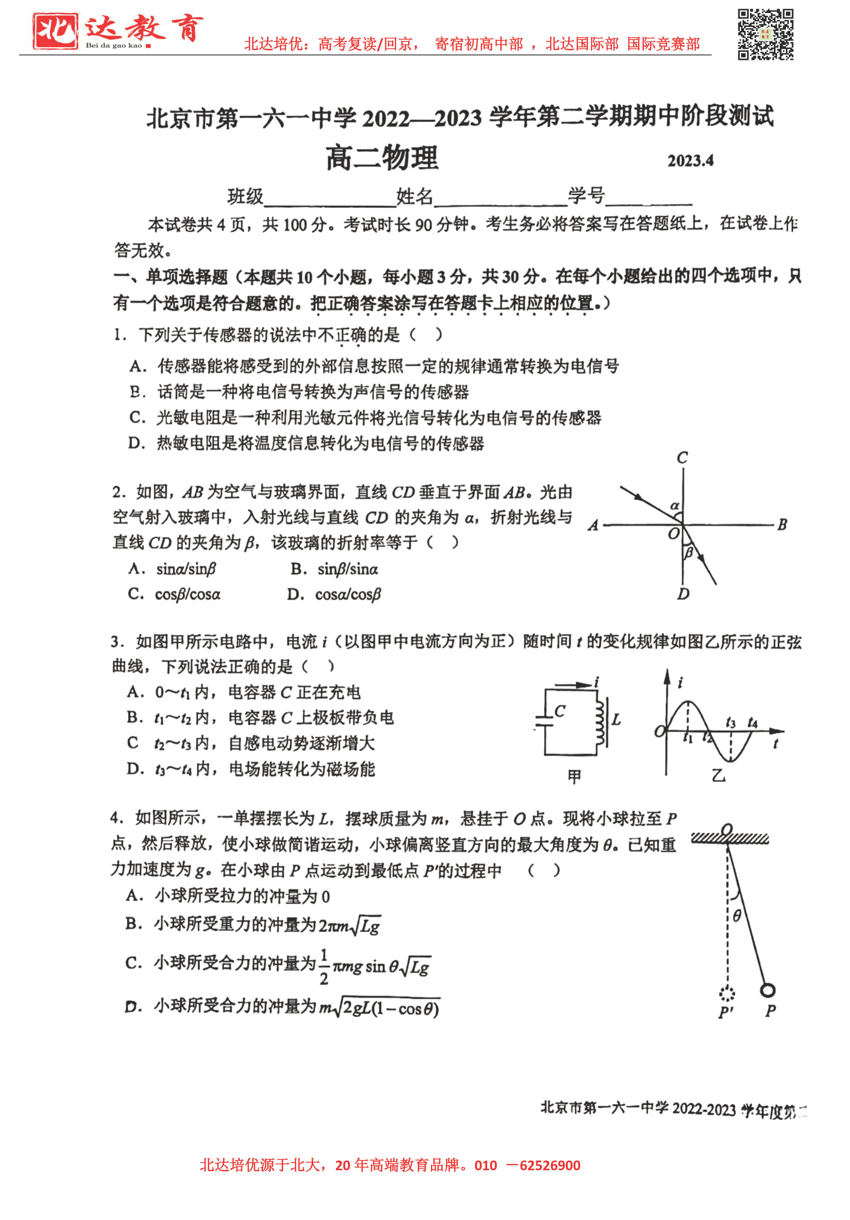 2022-2023学年北京各区高二年级下学期期中考试已开始,admw360高考复读学校整理了2022-2023学年北京一六一中高二(下)期中物理试题,供同学们在线下载!