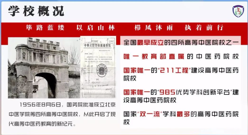 北京中医药大学是一所以中医药学为主干学科的全国重点大学,直属教育部管理,由教育部、国家卫生健康委员会、国家中医药管理局和北京市共建,是“211工程”重点建设大学和“985工程优势学科创新平台”建设高校。学校中医学、中西医结合、中药学3个学科入选国家“双一流”建设学科名单,是教育部新一届高等学校中医学类、中西医结合类专业教学指导委员会主任委员单位。在长期的办学实践中,学校秉承“勤求博采、厚德济生”校训,倡导“人心向学、传承创新”理念,坚持“立德树人、以文化人”宗旨,弘扬“追求卓越、止于至善”精神,彰显特色、强化优势,是我国培养高层次创新型中医药人才的教育基地、高等中医药教育改革的示范基地、中医药知识创新和技术创新的研究基地、防治重大疾病和疑难疾患的医疗基地、弘扬优秀传统文化的人文基地、推进中医药走向世界的国际交流基地,为人类健康事业发展和文明进步做出了重要贡献,已经成为在国内外享有盛誉的集教育、科研、医疗、中医药文化传播于一体的著名中医药高等学府。