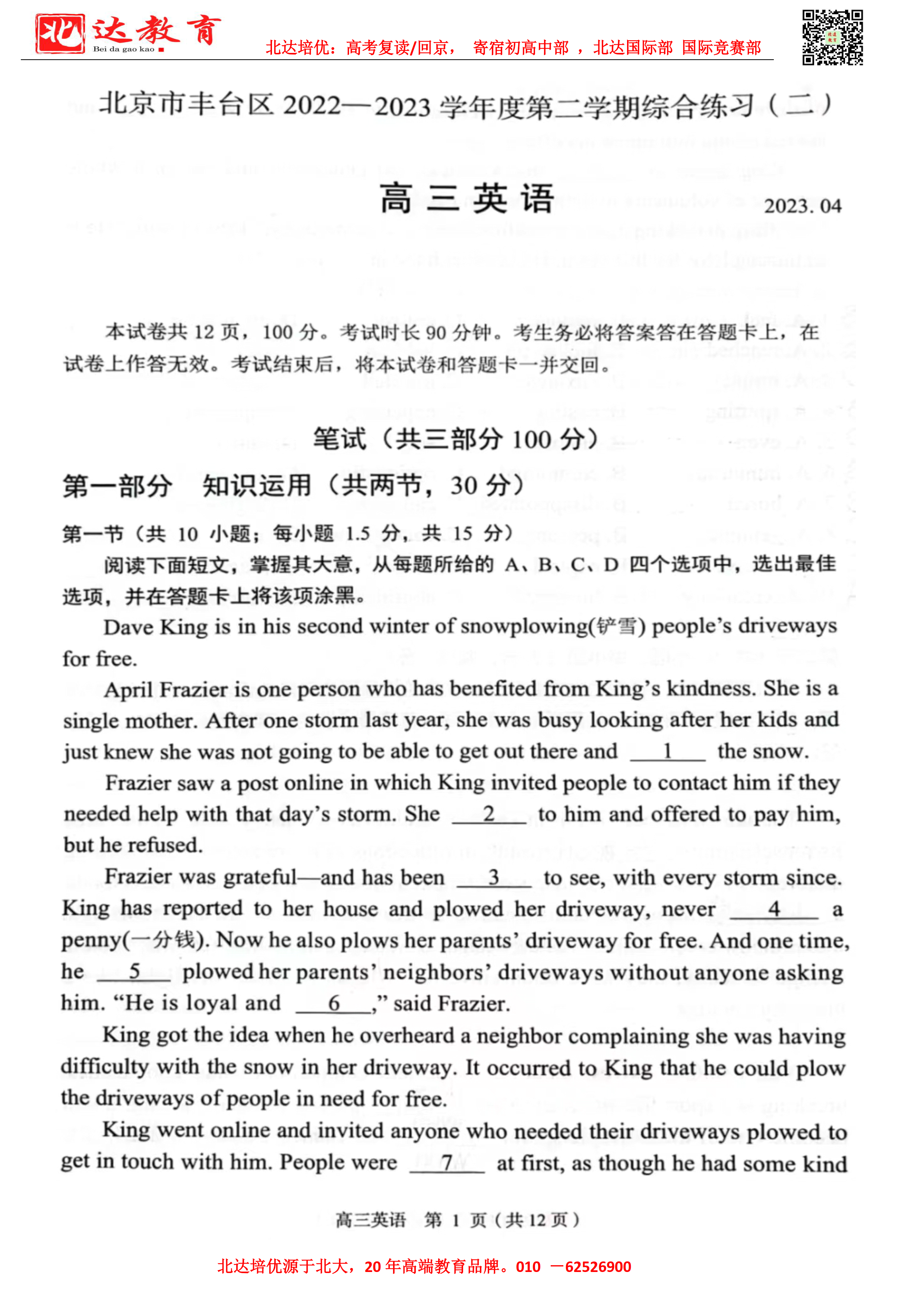 2023年北京丰台区高三二模考试预计于4月底进行。为了方便同学们查找相关试题及答案,admw360高考复读学校整理了2023年北京丰台区高三二模英语试题及答案,附高清电子版,欢迎为大家下载分享~