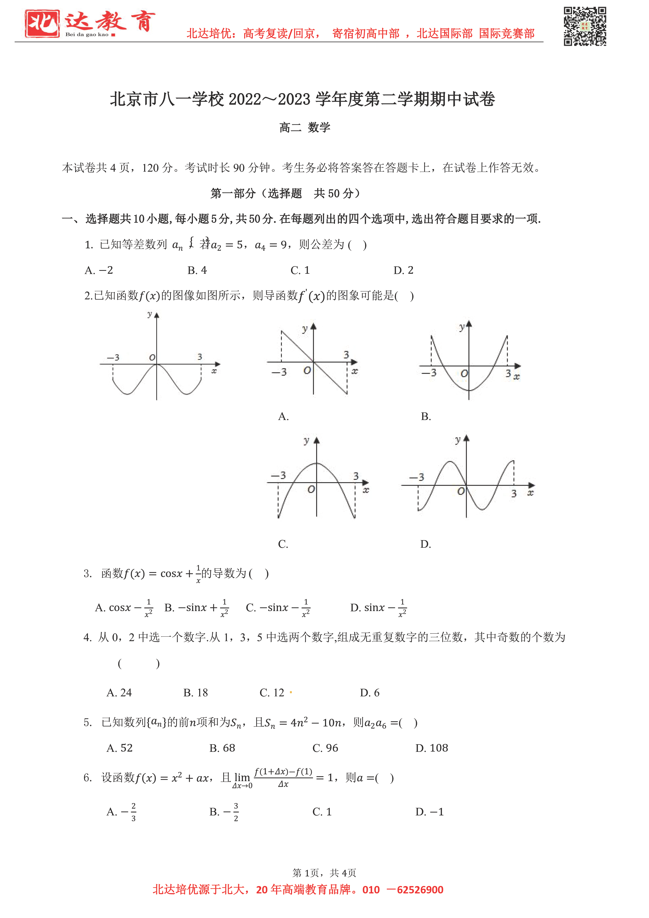 2022-2023学年北京各区高二年级下学期期中考试已开始,admw360高考复读学校整理了2022-2023学年北京八一学校高二(下)期中数学试题及答案,供同学们在线下载!
