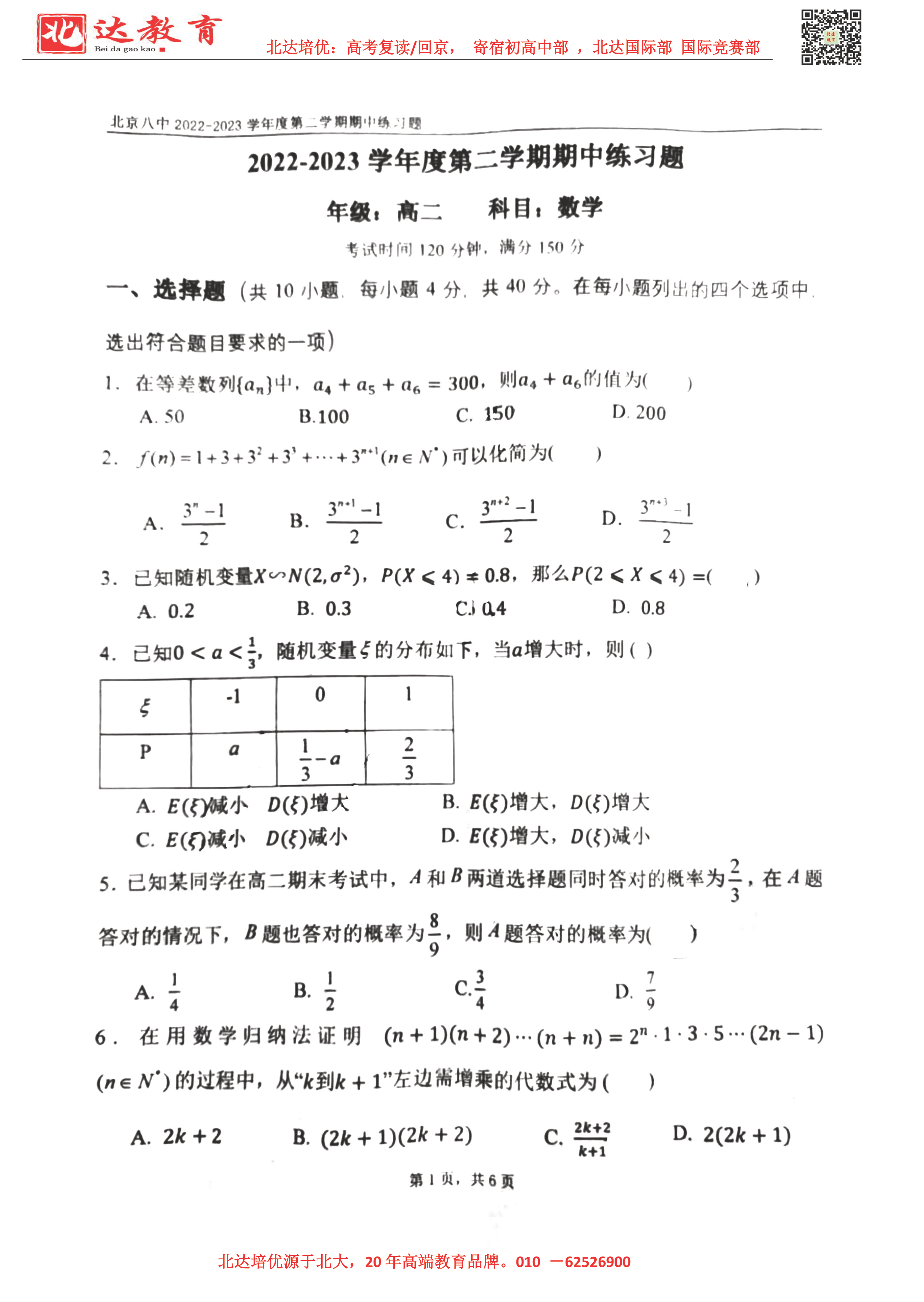 2022-2023学年北京各区高二年级下学期期中考试已开始,admw360高考复读学校整理了2022-2023学年北京八中高二(下)期中数学试题,供同学们在线下载!