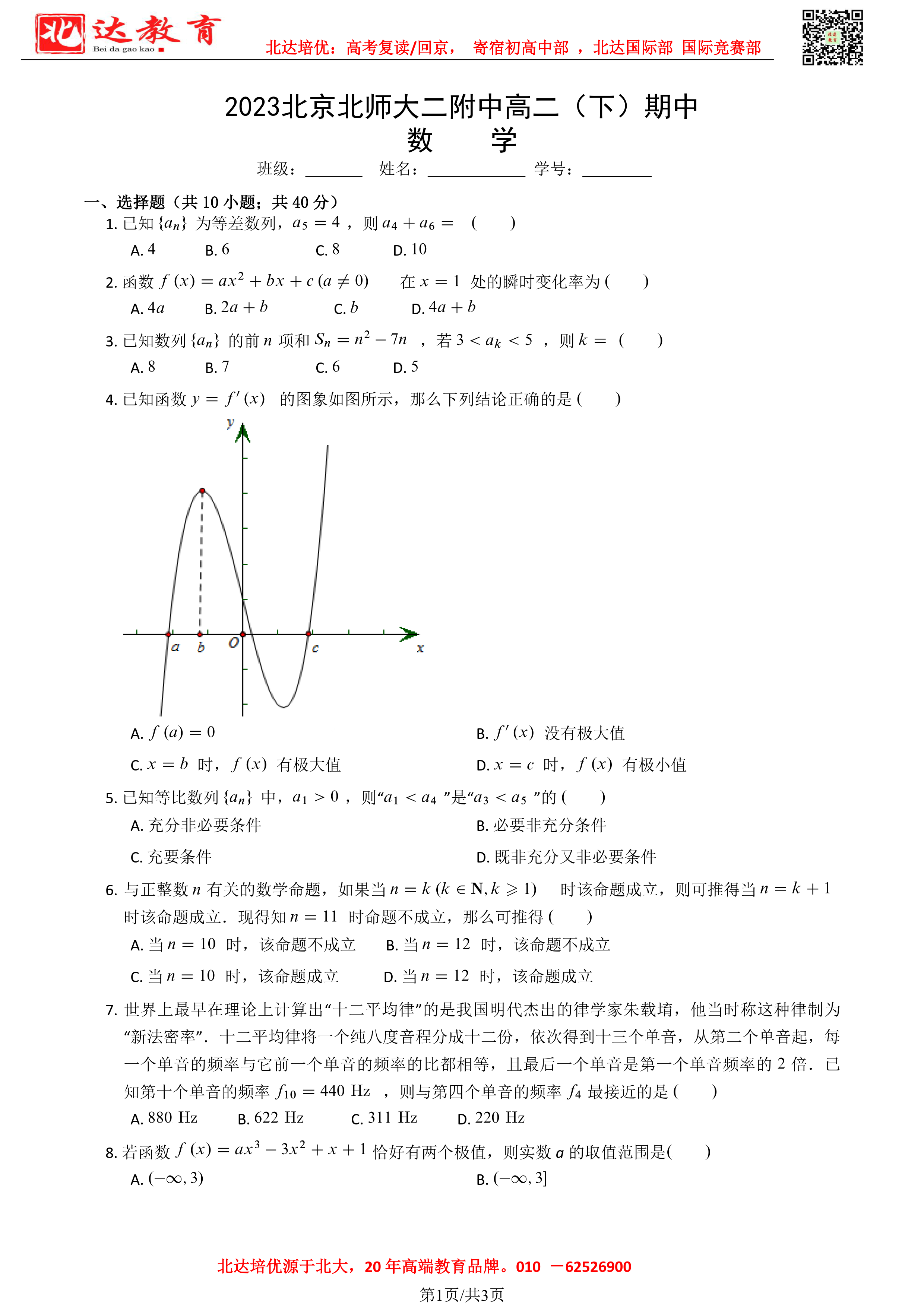 2022-2023学年北京各区高二年级下学期期中考试已开始,admw360高考复读学校整理了2022-2023学年北京北师大二附中高二(下)期中数学试题,供同学们在线下载!