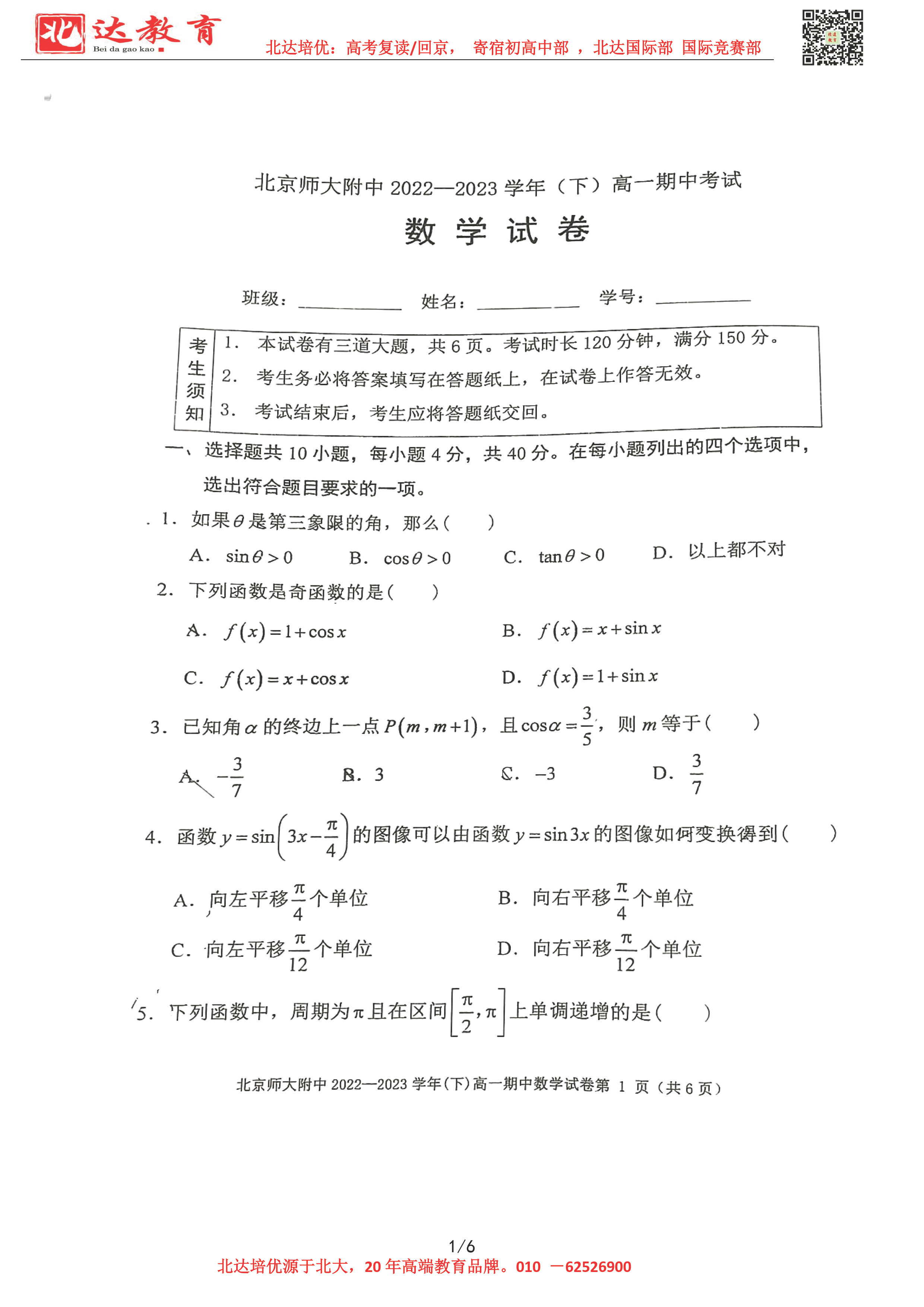 2022-2023学年北京各区高一年级下学期期中考试已开始,admw360高考复读学校整理了2022-2023学年北京北师大附中高一(下)期中数学试题及答案,供同学们在线下载!
