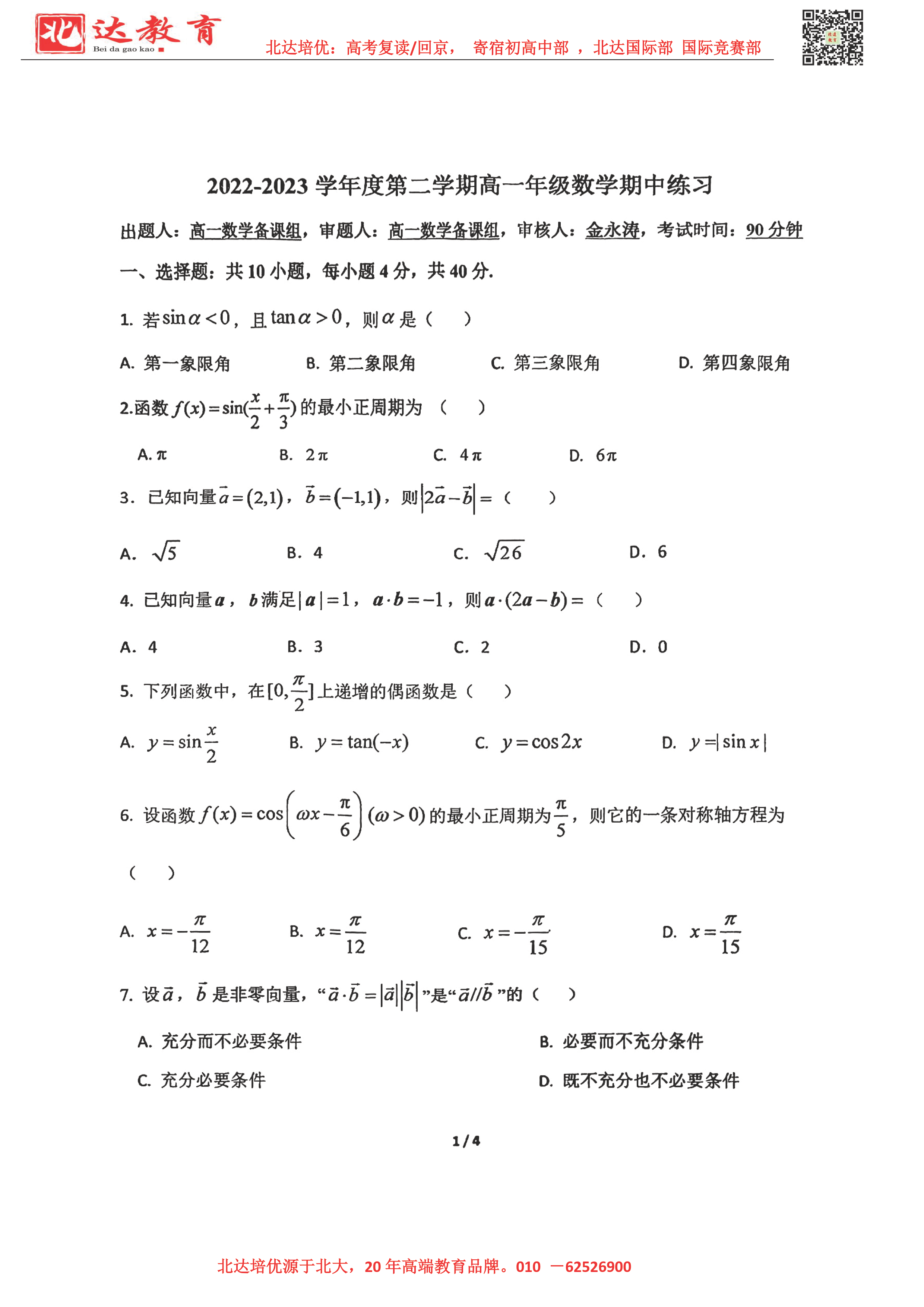 2022-2023学年北京各区高一年级下学期期中考试已开始,admw360高考复读学校整理了2022-2023学年北京理工大附中高一(下)期中数学试题及答案,供同学们在线下载!