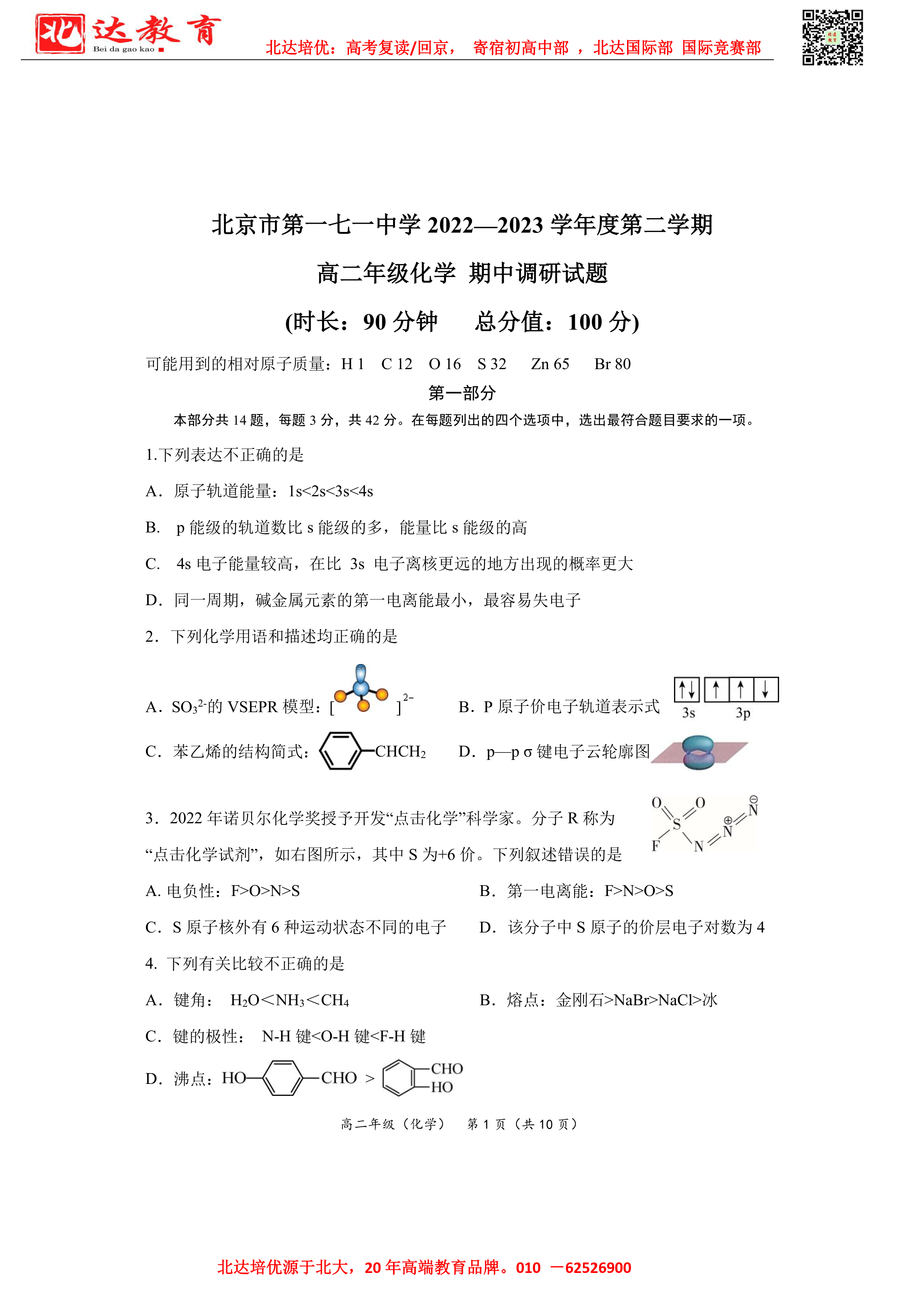 2022-2023学年北京各区高二年级下学期期中考试已开始,admw360高考复读学校整理了2022-2023学年北京一七一中高二(下)期中化学试题及答案,供同学们在线下载!