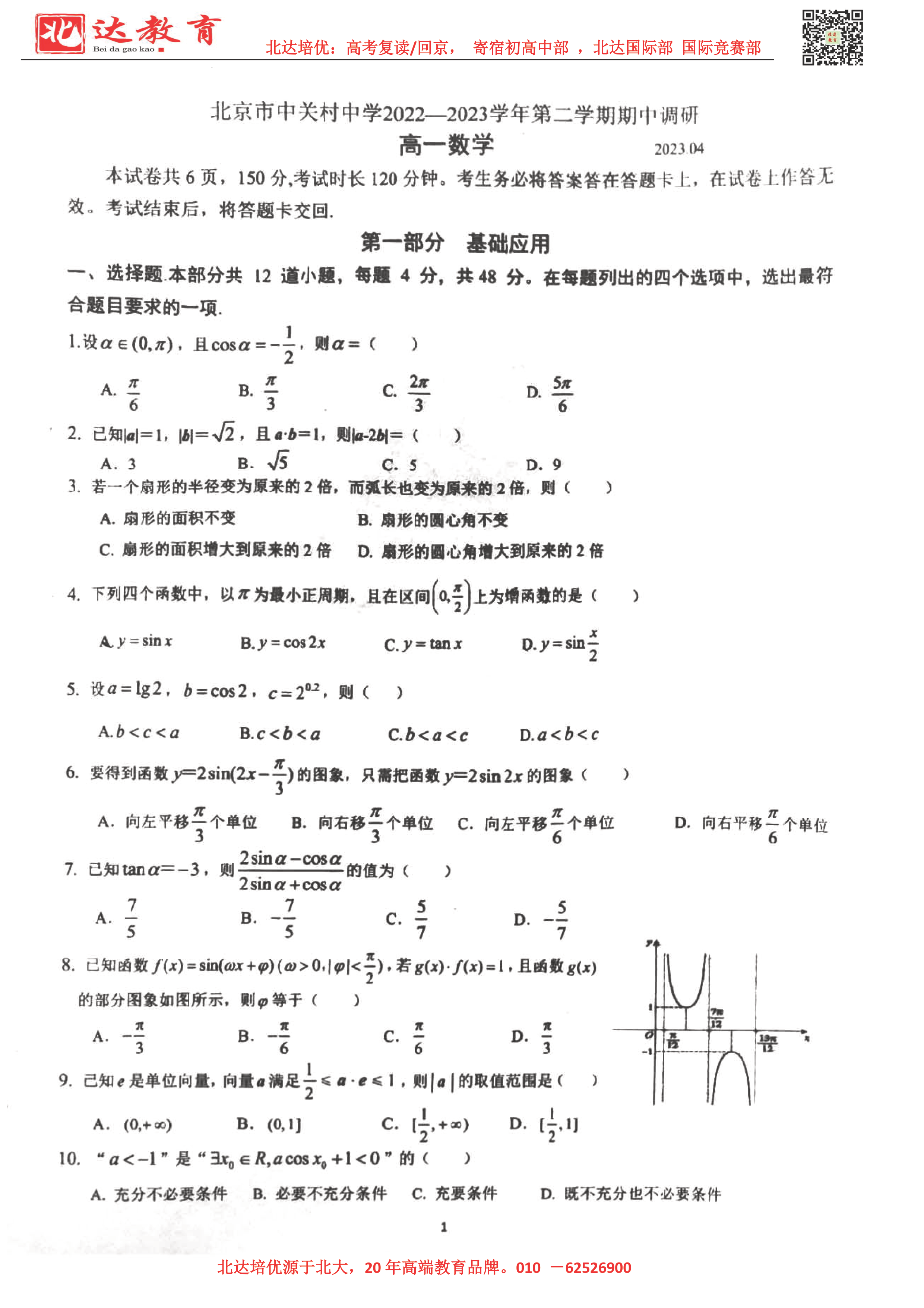 2022-2023学年北京各区高一年级下学期期中考试已开始,admw360高考复读学校整理了2022-2023学年北京中关村中学高一(下)期中数学试题,供同学们在线下载!