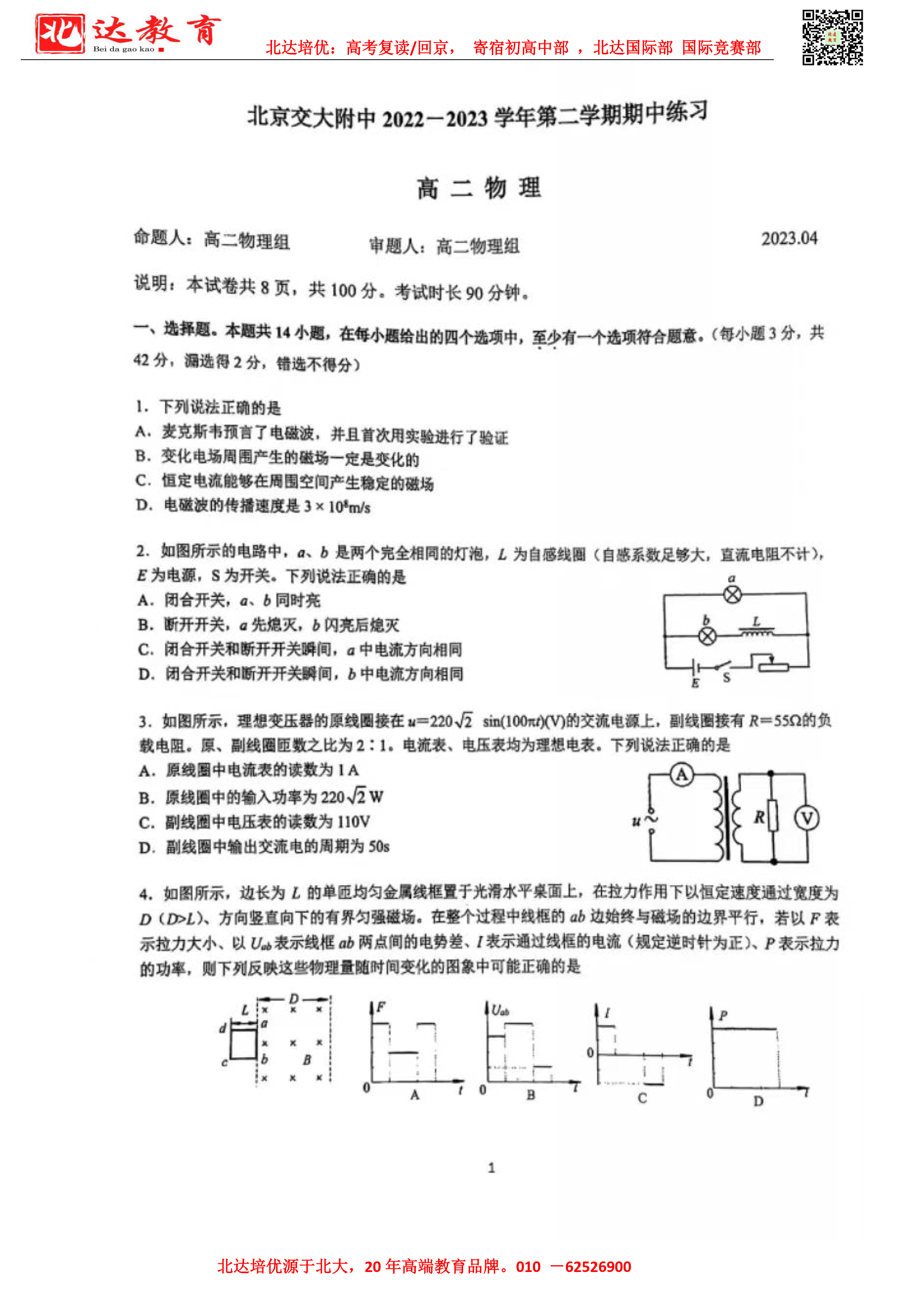 2022-2023学年北京各区高二年级下学期期中考试已开始,admw360高考复读学校整理了2022-2023学年北京交大附中高二(下)期中物理试题,供同学们在线下载!