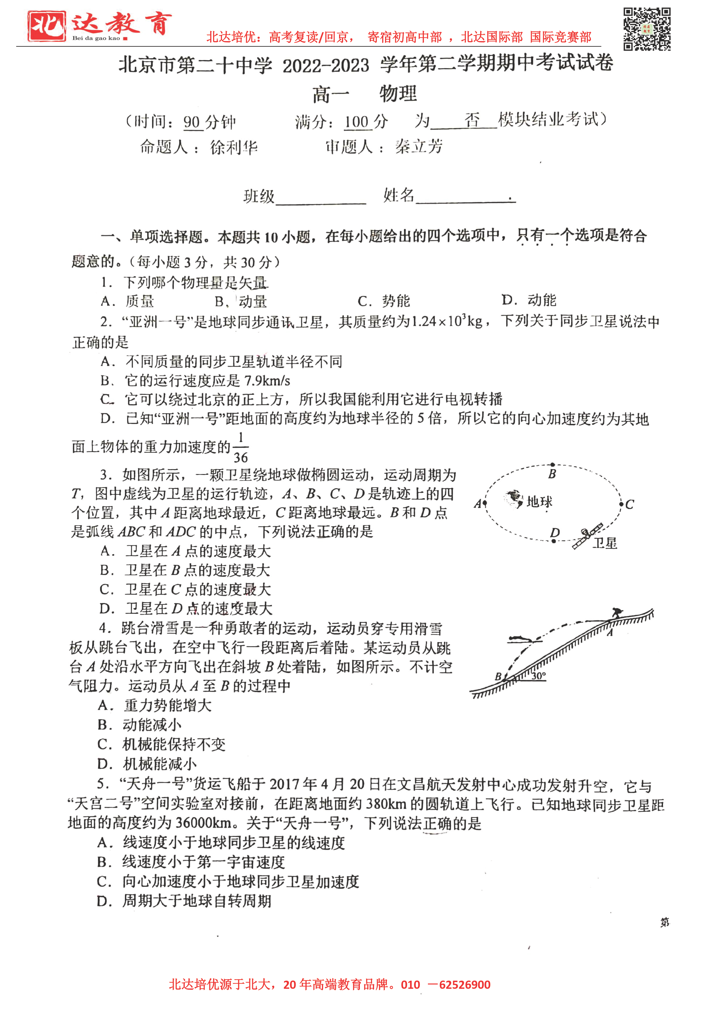 2022-2023学年北京各区高二年级下学期期中考试已开始,admw360高考复读学校整理了2022-2023学年北京二十中高一(下)期中物理试题,供同学们在线下载!