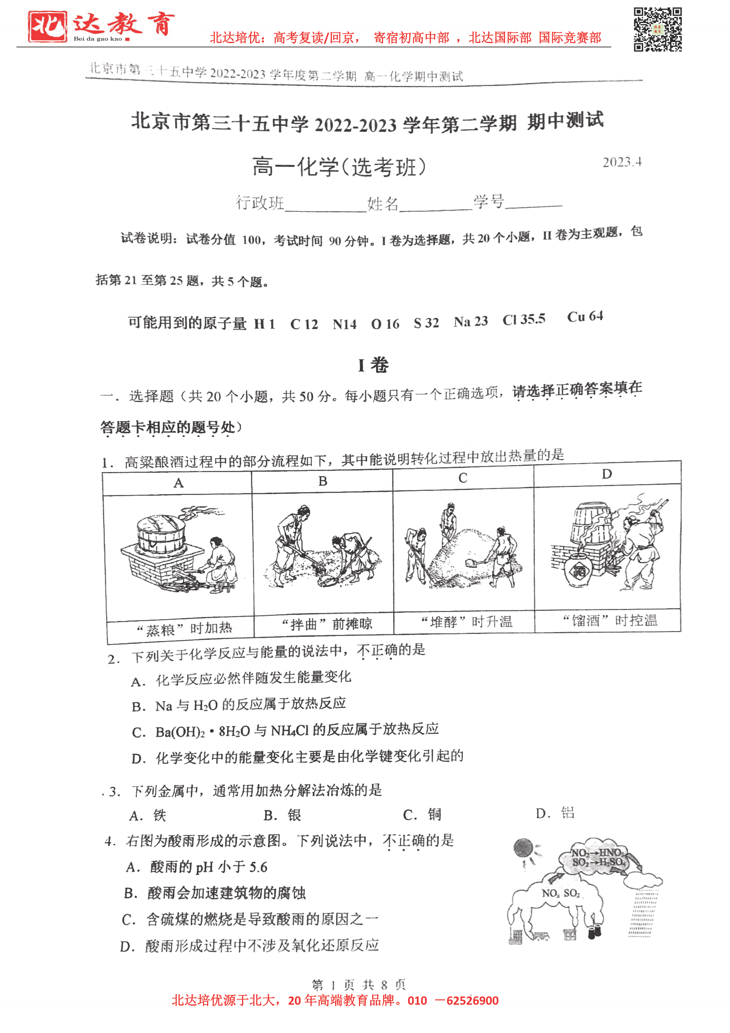 2022-2023学年北京各区高一年级下学期期中考试已开始,admw360高考复读学校整理了2022-2023学年北京三十五中高一(下)期中化学试题,供同学们在线下载!