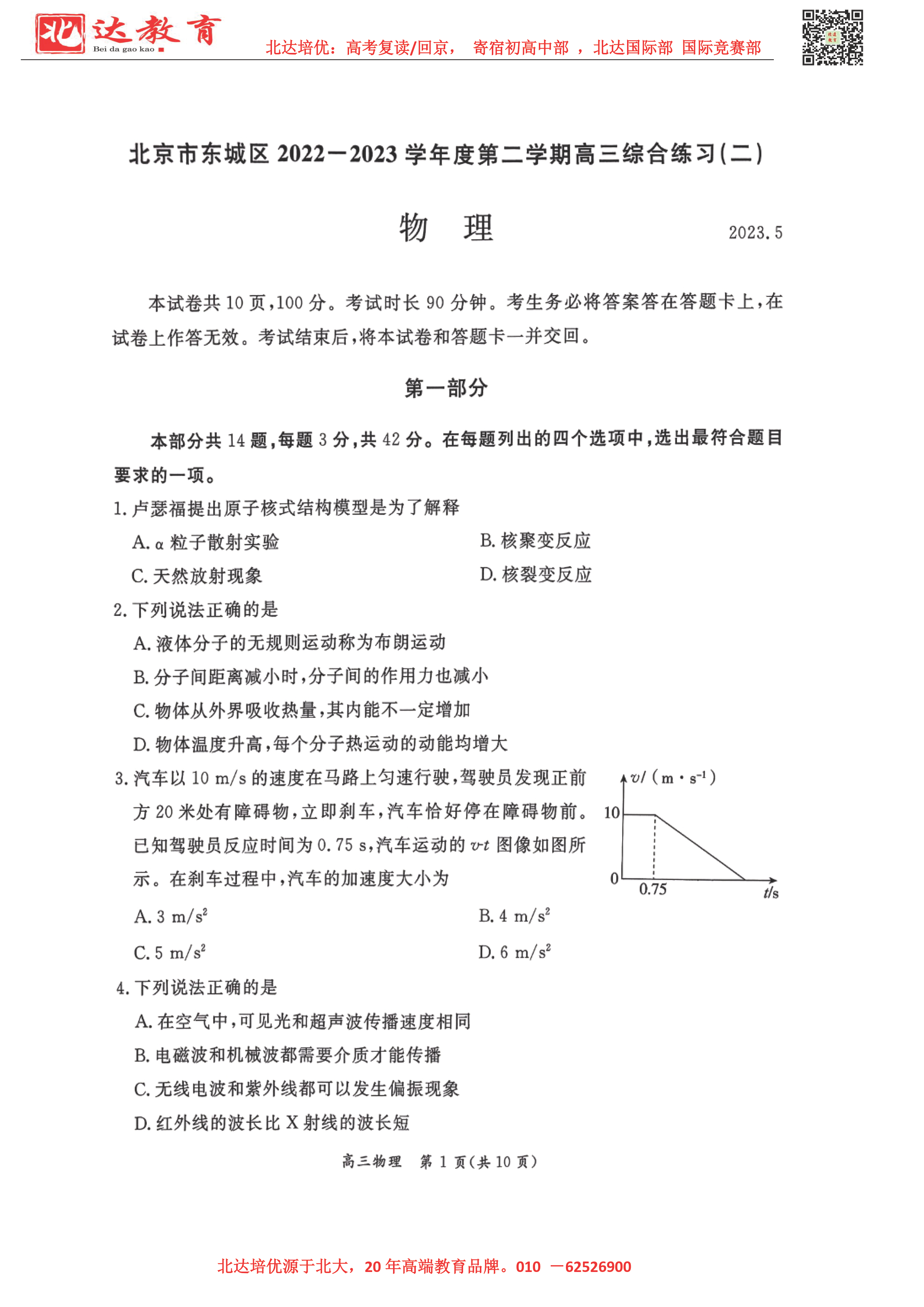 2023年北京东城区高三二模考试预于5月初进行,为了方便同学们查找相关试题及答案,admw360高考复读学校整理了2023年北京东城区高三二模物理试题及答案,附高清电子版,欢迎为大家下载分享~