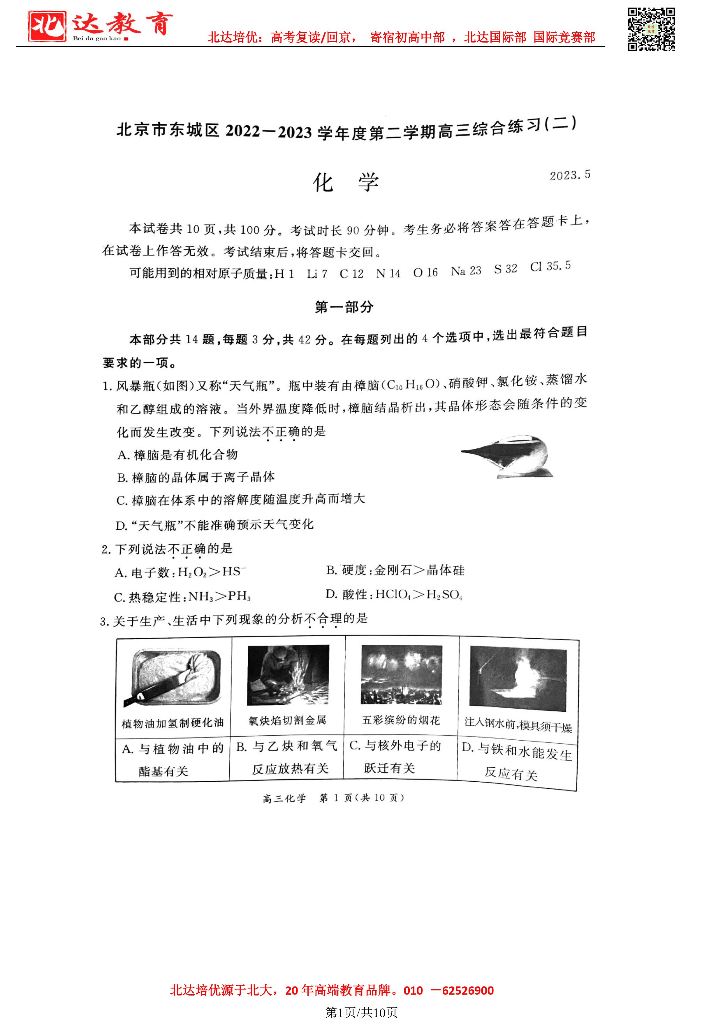 2023年北京东城区高三二模考试预于5月初进行,为了方便同学们查找相关试题及答案,admw360高考复读学校整理了2023年北京东城区高三二模化学试题及答案,附高清电子版,欢迎为大家下载分享~