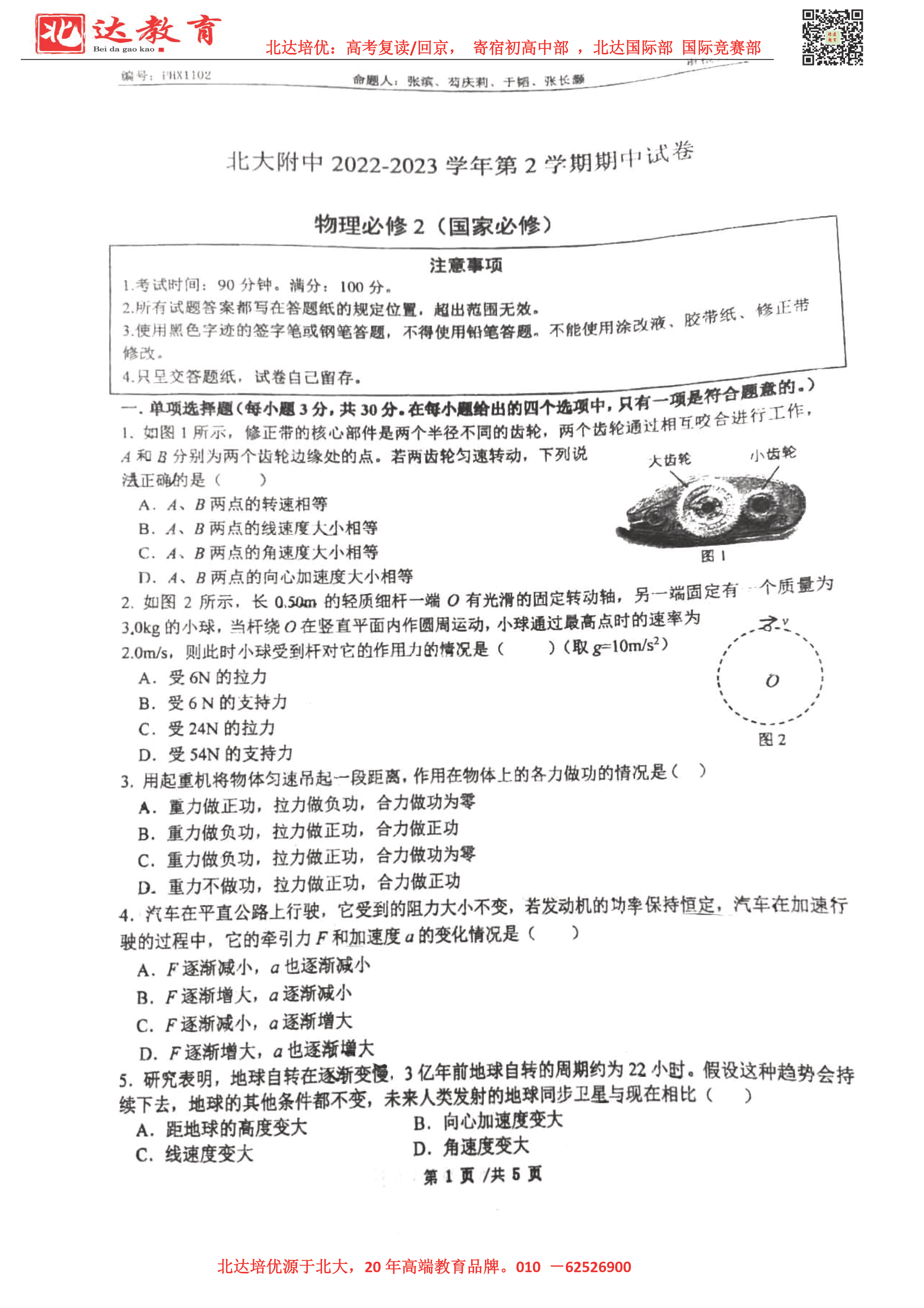 2022-2023学年北京各区高一年级下学期期中考试已开始,admw360高考复读学校整理了2022-2023学年北大附中高一(下)期中物理试题及答案,供同学们在线下载!