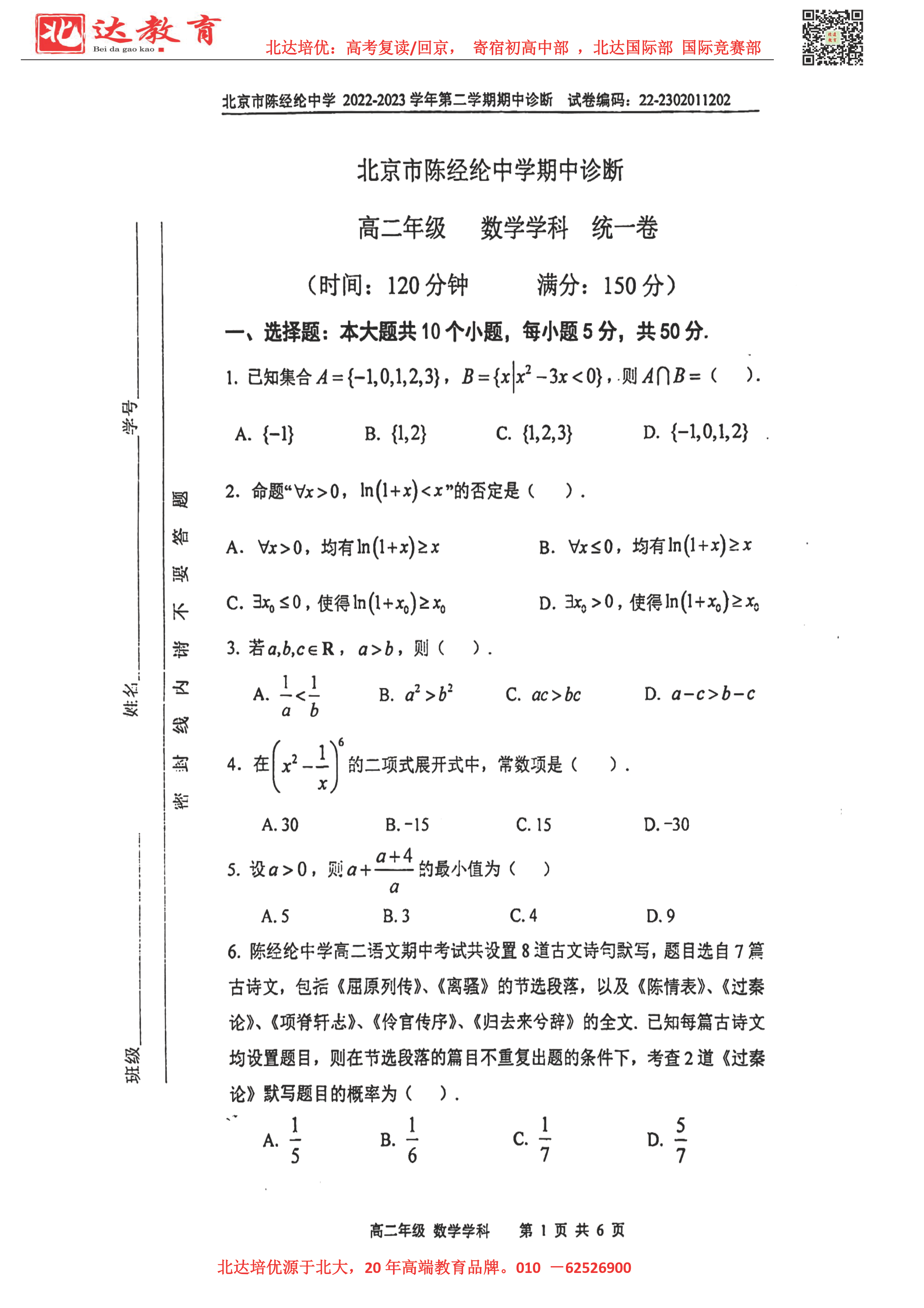 2022-2023学年北京各区高二年级下学期期中考试已开始,admw360高考复读学校整理了2022-2023学年北京陈经纶中学高二(下)期中数学试题,供同学们在线下载!