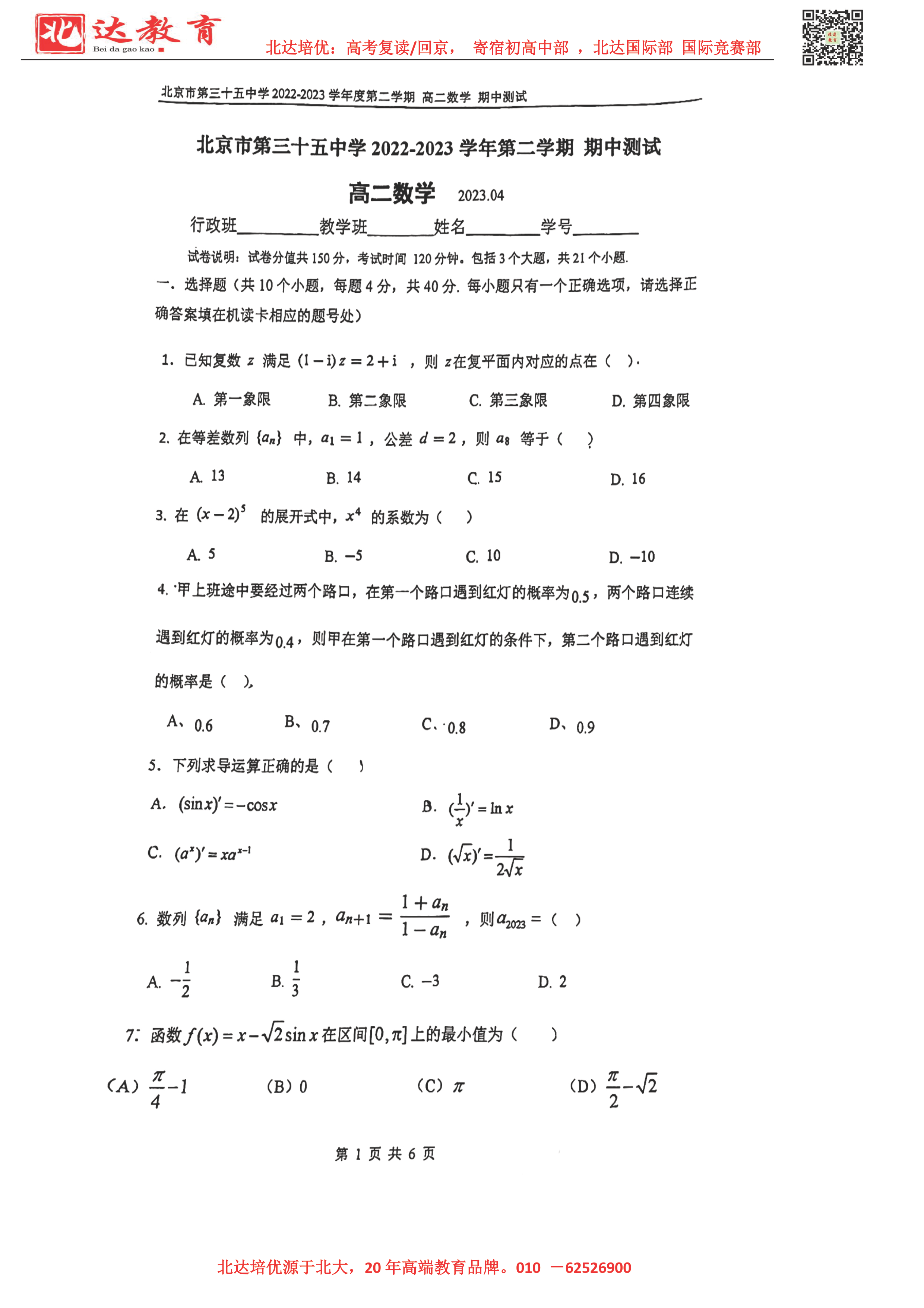 2022-2023学年北京各区高二年级下学期期中考试已开始,admw360高考复读学校整理了2022-2023学年北京三十五高二(下)期中数学试题,供同学们在线下载!